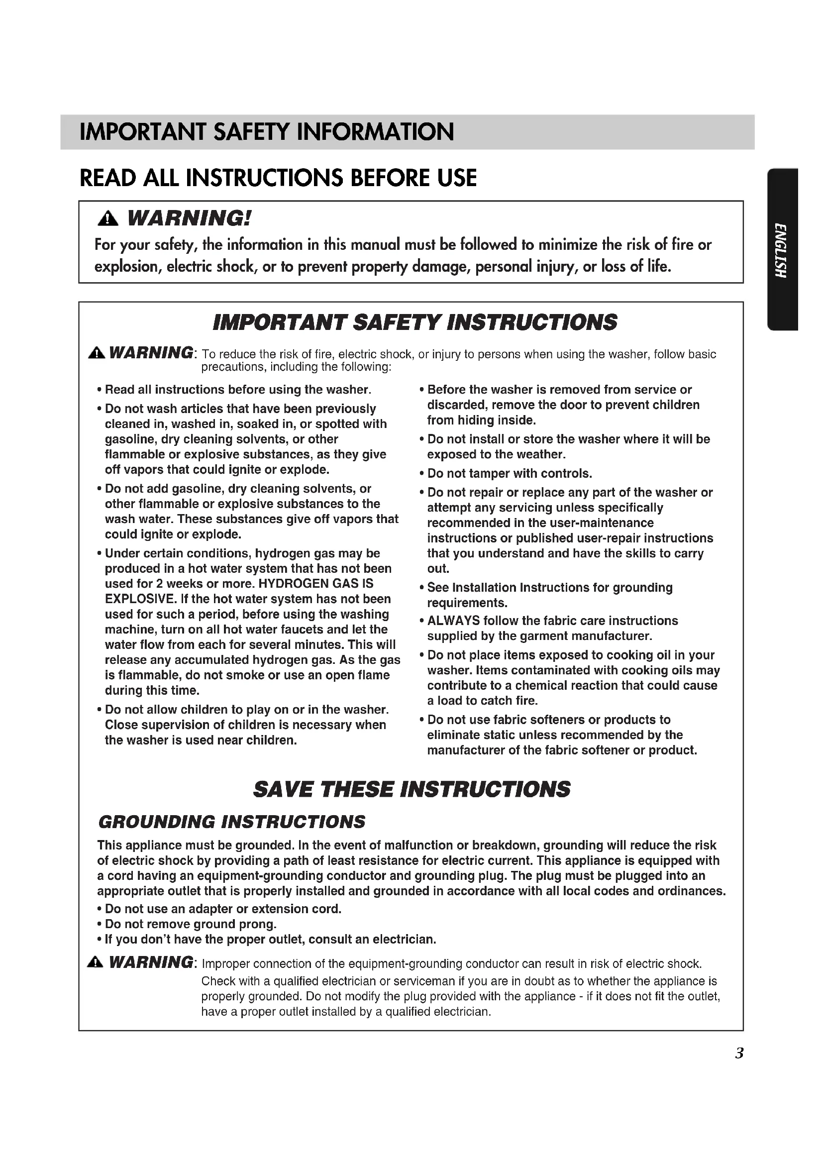 - See Installation Instructions for groundingrequirements.• ALWAYS follow the fabric care instructionssupplied by the garment manufacturer.• Do not place items exposed to cooking oil in yourwasher. Items contaminated with cooking oils maycontribute to a chemical reaction that could causea load to catch fire.• Do not use fabric softeners or products toeliminate static unless recommended by themanufacturer of the fabric softener or product. WARNING : To reduce the risk of fire, electric shock, or injury to persons when using the washer, follow basic precautions, including the following: