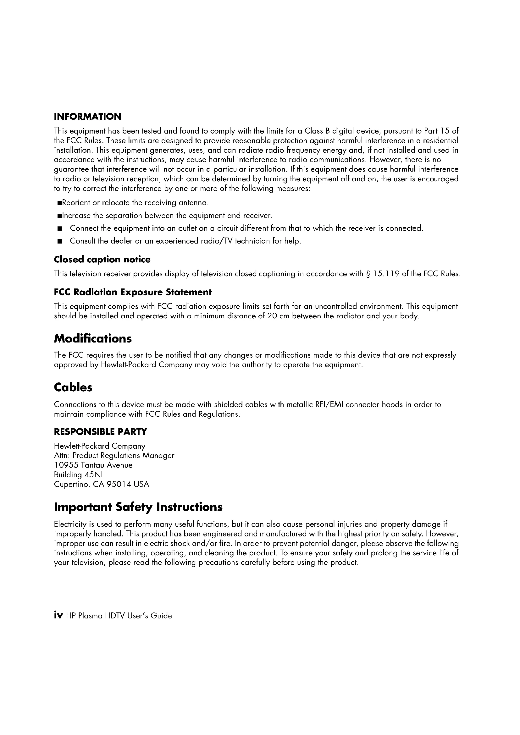 CAUTION: TO REDUCE THE RISK OF ELECTRICAL SHOCK, DO NOT REMOVE COVER (OR BACK). NO USER-SERVICEABLE PARTS INSIDE. REFER SERVICING TO QUALIFIED SERVICE PERSONNEL. THIS SYMBOL IS INTENDED TO ALERT THE USER TO THE PRESENCE OF UNINSULATED “DANGEROUS VOLTAGES” WITHIN THE PRODUCT’S ENCLOSURE THAT MAY BE OF SUFFICIENT MAGNITUDE TO CONSTITUTE A RISK OF ELECTRICAL SHOCK TO PERSONS. REFER SERVICING TO QUALIFIED SERVICE PERSONNEL. THIS SYMBOL IS INTENDED TO ALERT THE USER TO THE PRESENCE OF IMPORTANT OPERATING AND MAINTENANCE (SERVICING) INSTRUCTIONS IN THE LITERATURE ACCOMPANYING THE APPLIANCE. CAUTION: DO NOT PLACE THIS PRODUCT ON AN UNSTABLE CART, STAND, TRIPOD, BRACKET, OR TABLE. THE PRODUCT MAY FALL CAUSING SERIOUS PERSONAL INJURY AND SERIOUS DAMAGE TO THE PRODUCT. USE ONLY WITH A CART, STAND, TRIPOD, BRACKET, OR TABLE RECOMMENDED BY THE MANUFACTURER OR SOLD WITH THE PRODUCT. FOLLOW THE MANUFACTURER’S INSTRUCTIONS WHEN INSTALLING THE PRODUCT AND USE MOUNTING ACCESSORIES RECOMMENDED BY THE MANUFACTURER. A PRODUCT AND CART COMBINATION SHOULD BE MOVED WITH CARE. QUICK STOPS, EXCESSIVE FORCE, AND UNEVEN SURFACES MAY CAUSE THE PRODUCT AND CART COMBINATION TO OVERTURN. wiv HP Plasma HDTV User’s Guide INFORMATION This equipment has been tested and found to comply with the limits for a Class B digital device, pursuant to Part 15 of the FCC Rules. These limits are designed to provide reasonable protection against harmful interference in a residential installation. This equipment generates, uses, and can radiate radio frequency energy and, if not installed and used in accordance with the instructions, may cause harmful interference to radio communications. However, there is no guarantee that interference will not occur in a particular installation. If this equipment does cause harmful interference to radio or television reception, which can be determined by turning the equipment off and on, the user is encouraged to try to correct the interference by one or more of the following measures: ■ Reorient or relocate the receiving antenna. ■ Increase the separation between the equipment and receiver. ■ Connect the equipment into an outlet on a circuit different from that to which the receiver is connected. ■ Consult the dealer or an experienced radio/TV technician for help. Closed caption notice This television receiver provides display of television closed captioning in accordance with § 15.119 of the FCC Rules. FCC Radiation Exposure Statement This equipment complies with FCC radiation exposure limits set forth for an uncontrolled environment. This equipment should be installed and operated with a minimum distance of 20 cm between the radiator and your body. Modifications The FCC requires the user to be notified that any changes or modifications made to this device that are not expressly approved by Hewlett-Packard Company may void the authority to operate the equipment. Cables Connections to this device must be made with shielded cables with metallic RFI/EMI connector hoods in order to maintain compliance with FCC Rules and Regulations. RESPONSIBLE PARTY Hewlett-Packard Company Attn: Product Regulations Manager 10955 Tantau Avenue Building 45NL Cupertino, CA 95014 USA Important Safety Instructions Electricity is used to perform many useful functions, but it can also cause personal injuries and property damage if improperly handled. This product has been engineered and manufactured with the highest priority on safety. However, improper use can result in electric shock and/or fire. In order to prevent potential danger, please observe the following instructions when installing, operating, and cleaning the product. To ensure your safety and prolong the service life of your television, please read the following precautions carefully before using the product.v