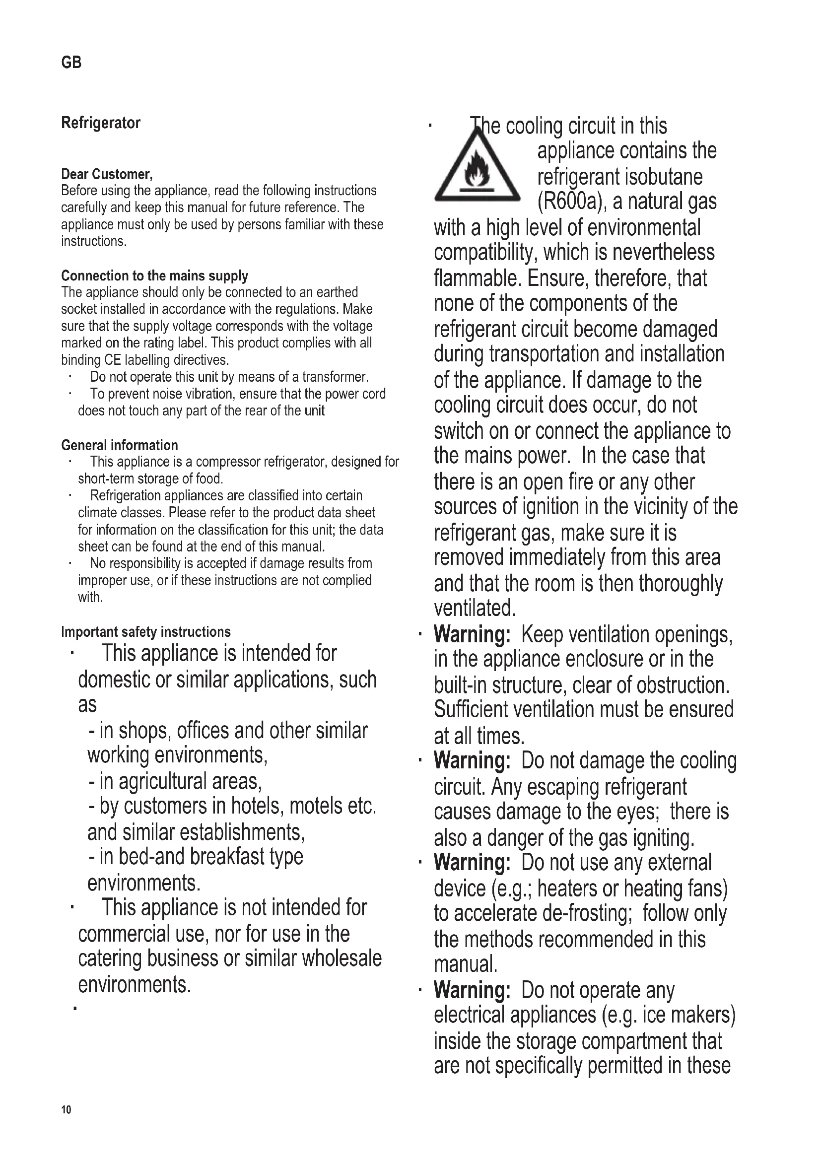 ∙ The cooling circuit in this appliance contains the refrigerant isobutane (R600a), a natural gas with a high level of environmental compatibility, which is nevertheless ammable. Ensure, therefore, that none of the components of the refrigerant circuit become damaged during transportation and installation of the appliance. If damage to the cooling circuit does occur, do not switch on or connect the appliance to the mains power. In the case that there is an open re or any other sources of ignition in the vicinity of the refrigerant gas, make sure it is removed immediately from this area and that the room is then thoroughly ventilated. ∙ Warning: Keep ventilation openings, in the appliance enclosure or in the built-in structure, clear of obstruction. Sufcient ventilation must be ensured at all times. ∙ Warning: Do not damage the cooling circuit. Any escaping refrigerant causes damage to the eyes; there is also a danger of the gas igniting. ∙ Warning: Do not use any external device (e.g.; heaters or heating fans) to accelerate de-frosting; follow only the methods recommended in this manual. ∙ Warning: Do not operate any electrical appliances (e.g. ice makers) inside the storage compartment that are not specically permitted in these GB11 142 x 208 mm instructions. ∙ Before it is connected to the mains power, the unit must be thoroughly checked for transport damage, including its power cord. In the event of any such damage being found, the appliance must not be connected to the mains. ∙ When positioning the appliance, ensure the supply cord is not trapped or damaged. ∙ Do not locate multiple portable socket- outlets or portable power supplies at the rear of the appliance. ∙ This appliance is not designed for the storage of explosive substances such as aerosol cans with a ammable propellant. ∙ If the unit is sold, handed over to a third party or disposed of at a suitable recycling facility, attention must be drawn to the presence of the insulation agent ‘cyclopenthane’ as well as to the refrigerant R600a. For additional information on correct recycling please refer to the section Disposal. ∙ In order to comply with safety regulations and to avoid hazards, any repairs or modications to this unit must be carried out by our authorised service personnel, including the replacement of the power cord. ∙ This appliance may be used by children (at least 8 years of age) and by persons with reduced physical, sensory or mental capabilities, or lacking experience and knowledge, provided they have been given supervision or instruction concerning the use of the appliance and fully understand all dangers and safety precautions involved. ∙ Children aged from 3 to 8 years are allowed to load and unload refrigerating appliances. ∙ Children must not be permitted to play with the appliance. ∙ Children must not be permitted to carry out any cleaning or maintenance work on the appliance. ∙ For frequent cleaning we recommend the use of warm water with some mild detergent. For detailed information on cleaning the appliance, please refer to the section De-frosting and cleaning. To avoid contamination of food respect the following instructions: ∙ Opening the door for long periods can cause a signicant increase of the temperature in the compartments of the appliance. ∙ Clean regularly surfaces that can come in contact with food and accessible drainage systems. ∙ Store raw meat and sh in suitable containers in the refrigerator so that it is not in contact with or drip onto other food. ∙ If the refrigerating appliance is left empty for long periods switch off, defrost, clean, dry and leave the door open to prevent mould developing within the appliance.12 142 x 208 mm Storing food ∙ The temperatures inside the refrigerator cabinet and cold storage compartment depend mainly on the ambient temperature, the temperature control setting and the amount of food stored. Cold storage compartment: ∙ The cold storage compartment is specically designed for short-term storage of fresh meat, sh and poultry. Main cabinet ∙ Different areas of the refrigerator cabinet are affected differently by the cooling effect. The warmest area is around the door in the higher part of the cabinet, the coldest around the rear wall and in the lower part of the cabinet. ∙ The food should therefore be stored as follows: ∙ On main cabinet shelves (from top to bottom): bakery items, ready meals, dairy products, meat, sh and cold meats/sausages. ∙ In the door (from top to bottom): butter, cheese, eggs, tubes (eg mustard), small bottles, large bottles, milk and fruit-juice tetra-packs. ∙ To prevent the risk of personal injury or damage to the unit, it must only be transported while in its original packaging. ∙ Caution: Keep any packaging materials well away from children: there is a risk of suffocation. ∙ The ice removed from the unit during de-frosting is not suitable for human consumption. ∙ The power cord should be regularly examined for any signs of damage. In the event of such damage being found, the appliance must no longer be used. ∙ To avoid the risk of re, do not place any thermo-electric appliances on top of the unit. Do not place liquid containers on top of the unit, to prevent any leaking or escaping liquid damaging the electrical insulation. ∙ This unit is designed for storing food only. ∙ Alcoholic substances may be stored only in properly sealed containers and in upright positions. ∙ Do not store any glass bottles containing carbonated or other freezable liquids in the unit: such bottles may burst during the freezing process. ∙ To avoid the risk of food poisoning, do not consume food after its storage time has expired. Thawed foods must not be frozen a second time. ∙ Do not lean or put undue weight on the shelves, compartments, door etc. ∙ Protect the inside of the refrigerator at all times from open ames and any other sources of ignition. ∙ Remove the plug from the w