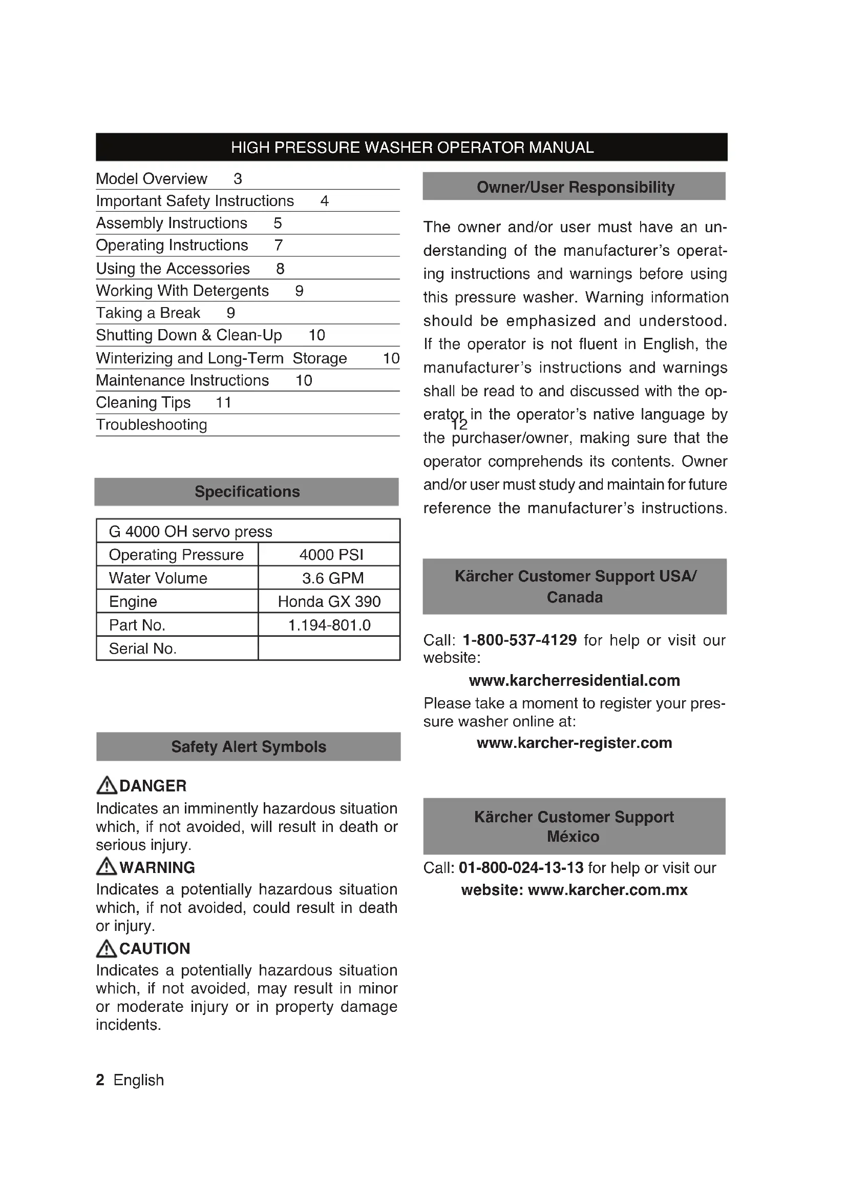 DANGER Indicates an imminently hazardous situation which, if not avoided, will result in death or serious injury. WARNING Indicates a potentially hazardous situation which, if not avoided, could result in death or injury. CAUTION Indicates a potentially hazardous situation which, if not avoided, may result in minor or moderate injury or in property damage incidents. The owner and/or user must have an un- derstanding of the manufacturer’s operat- ing instructions and warnings before using this pressure washer. Warning information should be emphasized and understood. If the operator is not fl uent in English, the manufacturer’s instructions and warnings shall be read to and discussed with the op- erator in the operator’s native language by the purchaser/owner, making sure that the operator comprehends its contents. Owner and/or user must study and maintain for future reference the manufacturer’s instructions. Owner/User Responsibility Safety Alert Symbols G 4000 OH servo press Operating Pressure 4000 PSI Water Volume 3.6 GPM Engine Honda GX 390 Part No. 1.194-801.0 Serial No.English 3 1 Handle 2 Trigger gun 3 Trigger gun safety lock 4 High pressure hose 5 Gas tank 6 Spray wand 7 Dipstick 8 Water inlet with garden hose connector 9 High pressure outlet 10 Detergent suction tube with fi lter 11 Quick connect nozzles 12 Spark plug 13 Water inlet fi lter 14 Remote Pressure Control For engine details see engine manual. MODEL OVERVIEW