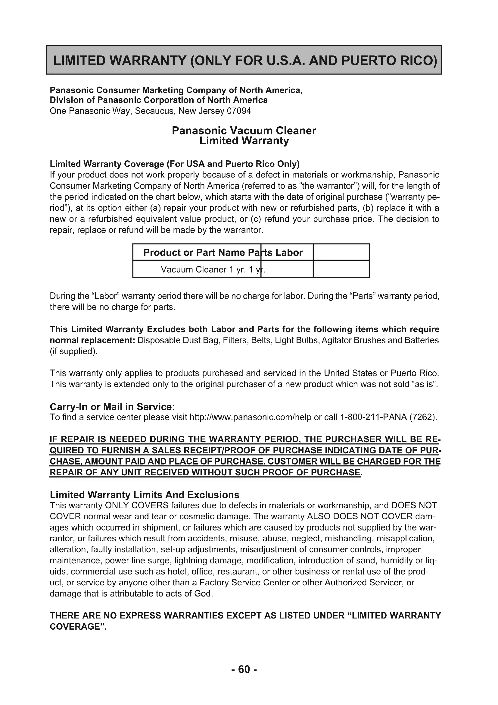 Power Nozzle botado. sobrecargas. (page 35) La aspiradora levanta 1. Ajuste incorrecto de nivel de pelo de 1. Ajuste el nivel. (page 27) tapetes –o– es difícil la alfombra. empuar a POWER 2. Aspiración demasiado potente. 2. Abra el control de aspiración. (page 39) NOZZLE La luz no funciona. 1. Bombilla fundida. 1. Cambie la bombilla. (page 55) El cordón no se 1. Cordón eléctrico sucio. 1. Limpie el cordón eléctrico. enrolla. 2. Cordón atascado. 2. Tire del cordón y después enróllelo. (page 23 & 25) La aspiradora deja 1. Estilo de limpieza incorrecta. 1. Consulte SUGERENCIAS PARA marcas en la alfombra. ASPIRAR. (page 33) PROBLEMA CAUSA POSIBLE SOLUCIÓN POSIBLE- 59 -- 60 - LIMITED WARRANTY (ONLY FOR U.S.A. AND PUERTO RICO) Panasonic Consumer Marketing Company of North America, Division of Panasonic Corporation of North America One Panasonic Way, Secaucus, New Jersey 07094 Panasonic Vacuum Cleaner Limited Warranty Limited Warranty Coverage (For USA and Puerto Rico Only) If your product does not work properly because of a defect in materials or workmanship, Panasonic Consumer Marketing Company of North America (referred to as “the warrantor”) will, for the length of the period indicated on the chart below, which starts with the date of original purchase (“warranty pe- riod”), at its option either (a) repair your product with new or refurbished parts, (b) replace it with a new or a refurbished equivalent value product, or (c) refund your purchase price. The decision to repair, replace or refund will be made by the warrantor. During the “Labor” warranty period there will be no charge for labor. During the “Parts” warranty period, there will be no charge for parts. This Limited Warranty Excludes both Labor and Parts for the following items which require normal replacement: Disposable Dust Bag, Filters, Belts, Light Bulbs, Agitator Brushes and Batteries (if supplied). This warranty only applies to products purchased and serviced in the United States or Puerto Rico. This warranty is extended only to the original purchaser of a new product which was not sold “as is”. Carry-In or Mail in Service: To find a service center please visit http://www.panasonic.com/help or call 1-800-211-PANA (7262). IF REPAIR IS NEEDED DURING THE WARRANTY PERIOD, THE PURCHASER WILL BE RE- QUIRED TO FURNISH A SALES RECEIPT/PROOF OF PURCHASE INDICATING DATE OF PUR- CHASE, AMOUNT PAID AND PLACE OF PURCHASE. CUSTOMER WILL BE CHARGED FOR THE REPAIR OF ANY UNIT RECEIVED WITHOUT SUCH PROOF OF PURCHASE. Limited Warranty Limits And Exclusions This warranty ONLY COVERS failures due to defects in materials or workmanship, and DOES NOT COVER normal wear and tear or cosmetic damage. The warranty ALSO DOES NOT COVER dam- ages which occurred in shipment, or failures which are caused by products not supplied by the war- rantor, or failures which result from accidents, misuse, abuse, neglect, mishandling, misapplication, alteration, faulty installation, set-up adjustments, misadjustment of consumer controls, improper maintenance, power line surge, lightning damage, modification, introduction of sand, humidity or liq- uids, commercial use such as hotel, office, restaurant, or other business or rental use of the prod- uct, or service by anyone other than a Factory Service Center or other Authorized Servicer, or damage that is attributable to acts of God. THERE ARE NO EXPRESS WARRANTIES EXCEPT AS LISTED UNDER “LIMITED WARRANTY COVERAGE”. Product or Part Name Parts Labor Vacuum Cleaner 1 yr. 1 yr.- 61 - THE WARRANTOR IS NOT LIABLE FOR INCIDENTAL OR CONSEQUENTIAL DAMAGES RE- SULTING FROM THE USE OF THIS PRODUCT, OR ARISING OUT OF ANY BREACH OF THIS WARRANTY. (As examples, this excludes damages for lost time, travel to and from the servicer, loss of or damage to media or images, data or other memory or recorded content. The items listed are not exclusive, but for illustration only.) ALL EXPRESS AND IMPLIED WARRANTIES, INCLUDING THE WARRANTY OF MER- CHANTABILITY, ARE LIMITED TO THE PERIOD OF THE LIMITED WARRANTY. Some states do not allow the exclusion or limitation of incidental or consequential damages, or limi- tations on how long an implied warranty lasts, so the exclusions may not apply to you. This warranty gives you specific legal rights and you may also have other rights which vary from state to state. If a problem with this product develops during or after the warranty period, you may contact your dealer or service center. If the problem is not handled to your satisfaction, then write to: Consumer Affairs Department Panasonic Consumer Marketing Company 661 Independence Pkwy Chesapeake, VA 23320 PARTS AND SERVICE, WHICH ARE NOT COVERED BY THIS LIMITED WARRANTY, ARE YOUR RESPONSIBILITY. Customer Services Directory (United States and Puerto Rico) Obtain Product Information and Operating Assistance; locate your nearest Dealer or Service Center; purchase Parts and Accessories; or make Customer Service and Literature requests by visiting our Web Site at: http://www.panasonic.com/help or, contact us via the web at: http://www.panasonic.com/contactinfo You may also contact us directly at: 1-800-211-PANA (7262) Monday-Friday 9am-9pm, Saturday-Sunday 10am-7pm EST For hearing or speech impaired TTY users, TTY: 1-877-833-8855 Accessory Purchases (United States and Puerto Rico) Purchase Parts, Accessories and Instruction Books online for all Panasonic Products by visiting our Web Site at: http://www.pstc.panasonic.com Or, send your request by E-mail to: npcparts@us.panasonic.com You may also contact us directly at: 1-800-332-5368 (Phone) 1-800-237-9080 (Fax Only) (Monday-Friday 9am-9pm EST) Panasonic National Parts Center 20421 84th Avenue South, Kent, WA 98032 (We accept Visa, MasterCard, Discover Card, and American Express) For hearing or speech impaired TTY users, TTY: 1-866-605-1277- 62 - WARRANTY Panasonic Canada Inc. 5770, Ambler Drive, Mississauga (Ontario) L4W 2T3