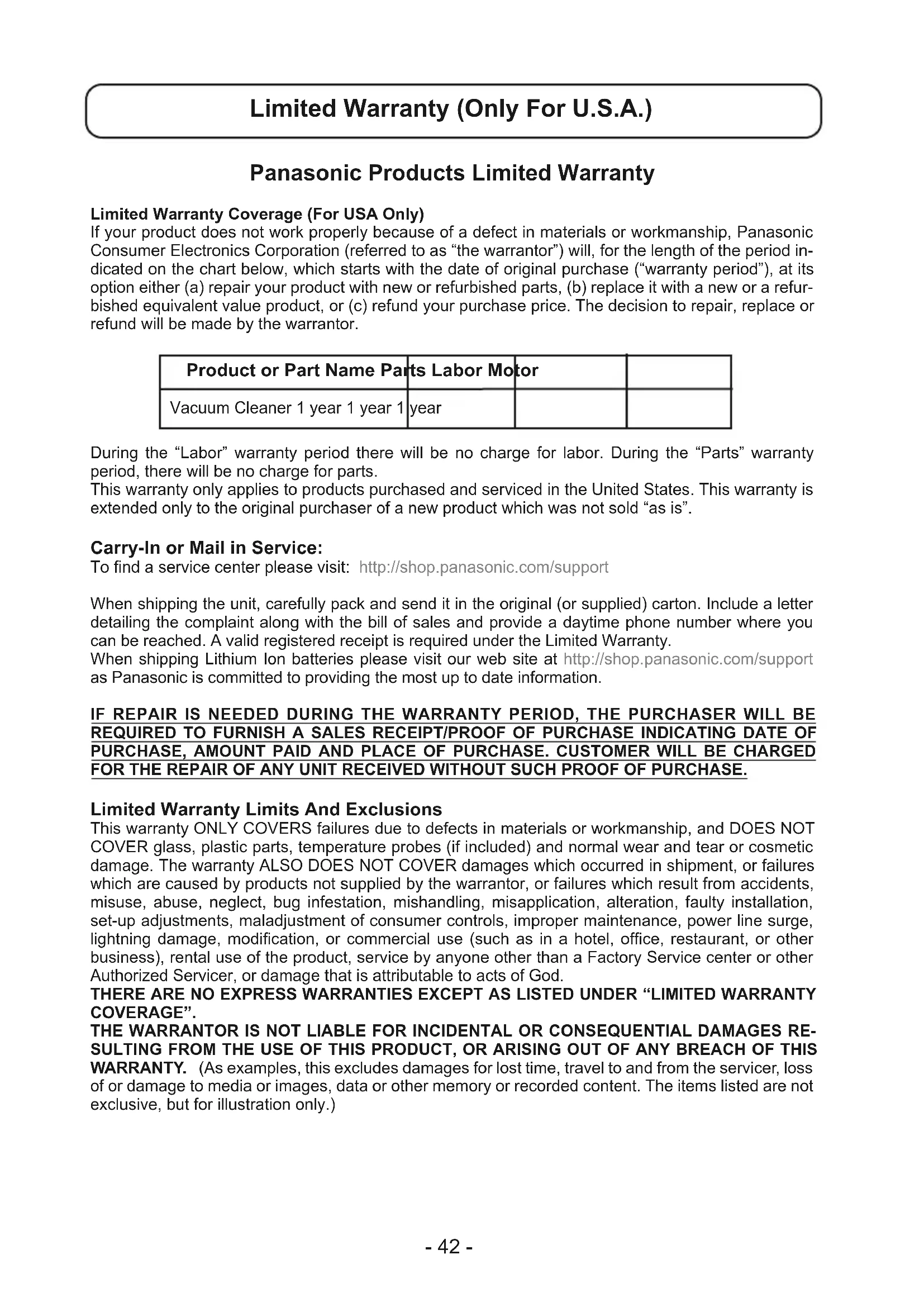 bien cerrada. La basura de 1. La bolsa no está bien cerrada. 1. Cierre bien la bolsa. sale de la bolsa para polvo. 2. Bolsa rota. 2. Cambie la bolsa. Consulte este cuadro para encontrar soluciones que usted mismo puede realizar cuando tenga problemas menores de rendimiento. Cualquier servicio que necesita aparte de otros descritos en este manual tiene que ser hecho por un representante de servicio autorizado. ADVERTENCIA Peligro de choque eléctrico y lesión personal. Desconecte la aspiradora antes de darle servicio o limpiarla. De lo contrario podría producirse un choque eléctrico o causar lesión personal si la aspiradora arranca de repente.- 41 - Notes, Remarque, Notas- 42 - Limited Warranty Coverage (For USA Only) If your product does not work properly because of a defect in materials or workmanship, Panasonic Consumer Electronics Corporation (referred to as “the warrantor”) will, for the length of the period in- dicated on the chart below, which starts with the date of original purchase (“warranty period”), at its option either (a) repair your product with new or refurbished parts, (b) replace it with a new or a refur- bished equivalent value product, or (c) refund your purchase price. The decision to repair, replace or refund will be made by the warrantor. During the “Labor” warranty period there will be no charge for labor. During the “Parts” warranty period, there will be no charge for parts. This warranty only applies to products purchased and serviced in the United States. This warranty is extended only to the original purchaser of a new product which was not sold “as is”. Carry-In or Mail in Service: To find a service center please visit: http://shop.panasonic.com/support When shipping the unit, carefully pack and send it in the original (or supplied) carton. Include a letter detailing the complaint along with the bill of sales and provide a daytime phone number where you can be reached. A valid registered receipt is required under the Limited Warranty. When shipping Lithium Ion batteries please visit our web site at http://shop.panasonic.com/support as Panasonic is committed to providing the most up to date information. IF REPAIR IS NEEDED DURING THE WARRANTY PERIOD, THE PURCHASER WILL BE REQUIRED TO FURNISH A SALES RECEIPT/PROOF OF PURCHASE INDICATING DATE OF PURCHASE, AMOUNT PAID AND PLACE OF PURCHASE. CUSTOMER WILL BE CHARGED FOR THE REPAIR OF ANY UNIT RECEIVED WITHOUT SUCH PROOF OF PURCHASE. Limited Warranty Limits And Exclusions This warranty ONLY COVERS failures due to defects in materials or workmanship, and DOES NOT COVER glass, plastic parts, temperature probes (if included) and normal wear and tear or cosmetic damage. The warranty ALSO DOES NOT COVER damages which occurred in shipment, or failures which are caused by products not supplied by the warrantor, or failures which result from accidents, misuse, abuse, neglect, bug infestation, mishandling, misapplication, alteration, faulty installation, set-up adjustments, maladjustment of consumer controls, improper maintenance, power line surge, lightning damage, modification, or commercial use (such as in a hotel, office, restaurant, or other business), rental use of the product, service by anyone other than a Factory Service center or other Authorized Servicer, or damage that is attributable to acts of God. THERE ARE NO EXPRESS WARRANTIES EXCEPT AS LISTED UNDER “LIMITED WARRANTY COVERAGE”. THE WARRANTOR IS NOT LIABLE FOR INCIDENTAL OR CONSEQUENTIAL DAMAGES RE- SULTING FROM THE USE OF THIS PRODUCT, OR ARISING OUT OF ANY BREACH OF THIS WARRANTY. (As examples, this excludes damages for lost time, travel to and from the servicer, loss of or damage to media or images, data or other memory or recorded content. The items listed are not exclusive, but for illustration only.) Panasonic Products Limited Warranty Product or Part Name Parts Labor Motor Vacuum Cleaner 1 year 1 year 1 year Limited Warranty (Only For U.S.A.)- 43 - ALL EXPRESS AND IMPLIED WARRANTIES, INCLUDING THE WARRANTY OF MERCHANTABILITY, ARE LIMITED TO THE PERIOD OF THE LIMITED WARRANTY. Some states do not allow the exclusion or limitation of incidental or consequential damages, or limitations on how long an implied warranty lasts, so the exclusions may not apply to you. This warranty gives you specific legal rights and you may also have other rights which vary from state to state. If a problem with this product develops during or after the warranty period, you may contact your dealer or Service Center. If the problem is not handled to your satisfaction, then write to: Consumer Affairs Department Panasonic Consumer Marketing Company 661 Independence Pkwy Chesapeake, VA 23320 PARTS AND SERVICE, WHICH ARE NOT COVERED BY THIS LIMITED WARRANTY, ARE YOUR RESPONSIBILITY. As of July 2015- 44 - WARRANTY Panasonic Canada Inc. 5770, Ambler Drive, Mississauga (Ontario) L4W 2T3