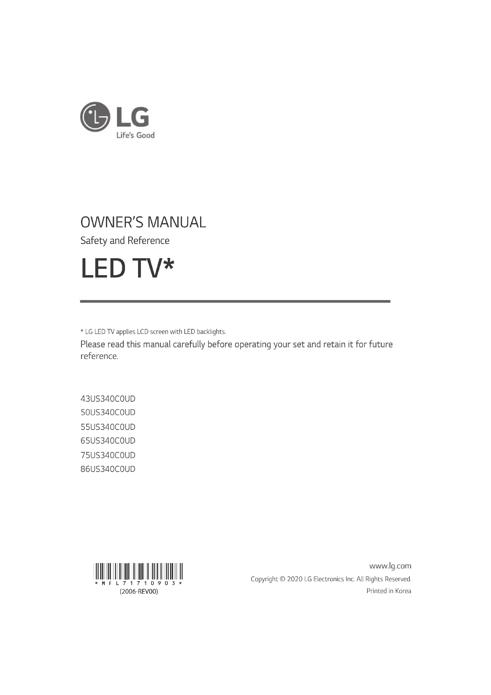 Safety and Reference LED TV* 43US340C0UD50US340C0UD55US340C0UD65US340C0UD75US340C0UD86US340C0UDwww.lg.comCopyright © 2020 LG Electronics Inc. All Rights Reserved.Printed in Korea* LG LED TV applies LCD screen with LED backlights. Please read this manual carefully before operating your set and retain it for future reference.2 ENGLISH Important Safety Instruction