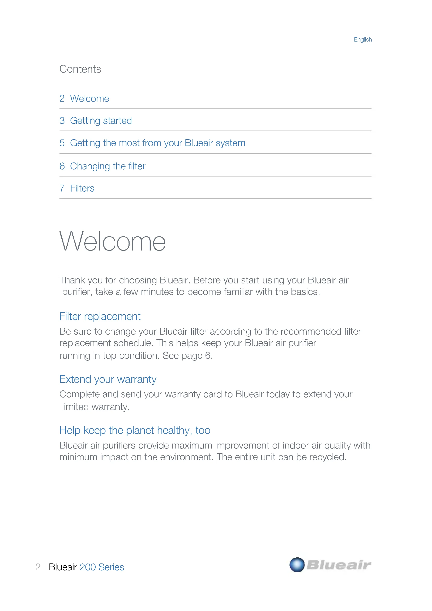 Blueair 200 Series User Manual 2 Manual del usuario 8 Guide d’utilisation 14 Blueair 200 Series/Serie/SérieWelcome Thank you for choosing Blueair. Before you start using your Blueair air purifier, take a few minutes to become familiar with the basics. Filter replacement Be sure to change your Blueair filter according to the recommended filter replacement schedule. This helps keep your Blueair air purifier running in top condition. See page 6. Extend your warranty Complete and send your warranty card to Blueair today to extend your limited warranty. Help keep the planet healthy, too Blueair air purifiers provide maximum improvement of indoor air quality with minimum impact on the environment. The entire unit can be recycled. Contents 2 Welcome 3 Getting started 5 Getting the most from your Blueair system 6 Changing the filter 7 Filters