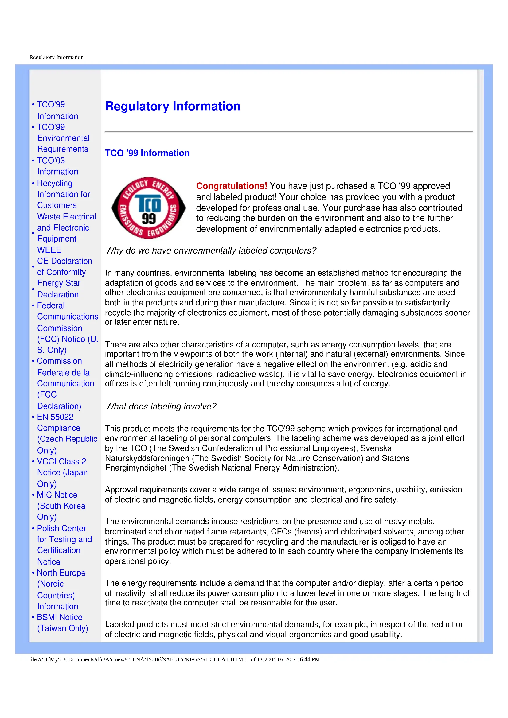 - BSMI Notice (Taiwan Only) Regulatory Information TCO '99 Information Congratulations! You have just purchased a TCO '99 approved and labeled product! Your choice has provided you with a product developed for professional use. Your purchase has also contributed to reducing the burden on the environment and also to the further development of environmentally adapted electronics products. Why do we have environmentally labeled computers? In many countries, environmental labeling has become an established method for encouraging the adaptation of goods and services to the environment. The main problem, as far as computers and other electronics equipment are concerned, is that environmentally harmful substances are used both in the products and during their manufacture. Since it is not so far possible to satisfactorily recycle the majority of electronics equipment, most of these potentially damaging substances sooner or later enter nature. There are also other characteristics of a computer, such as energy consumption levels, that are important from the viewpoints of both the work (internal) and natural (external) environments. Since all methods of electricity generation have a negative effect on the environment (e.g. acidic and climate-influencing emissions, radioactive waste), it is vital to save energy. Electronics equipment in offices is often left running continuously and thereby consumes a lot of energy. What does labeling involve? This product meets the requirements for the TCO'99 scheme which provides for international and environmental labeling of personal computers. The labeling scheme was developed as a joint effort by the TCO (The Swedish Confederation of Professional Employees), Svenska Naturskyddsforeningen (The Swedish Society for Nature Conservation) and Statens Energimyndighet (The Swedish National Energy Administration). Approval requirements cover a wide range of issues: environment, ergonomics, usability, emission of electric and magnetic fields, energy consumption and electrical and fire safety. The environmental demands impose restrictions on the presence and use of heavy metals, brominated and chlorinated flame retardants, CFCs (freons) and chlorinated solvents, among other things. The product must be prepared for recycling and the manufacturer is obliged to have an environmental policy which must be adhered to in each country where the company implements its operational policy. The energy requirements include a demand that the computer and/or display, after a certain period of inactivity, shall reduce its power consumption to a lower level in one or more stages. The length of time to reactivate the computer shall be reasonable for the user. Labeled products must meet strict environmental demands, for example, in respect of the reduction of electric and magnetic fields, physical and visual ergonomics and good usability. file:///D|/My%20Documents/dfu/A5_new/CHINA/150B6/SAFETY/REGS/REGULAT.HTM (1 of 13)2005-07-20 2:36:44 PMRegulatory Information