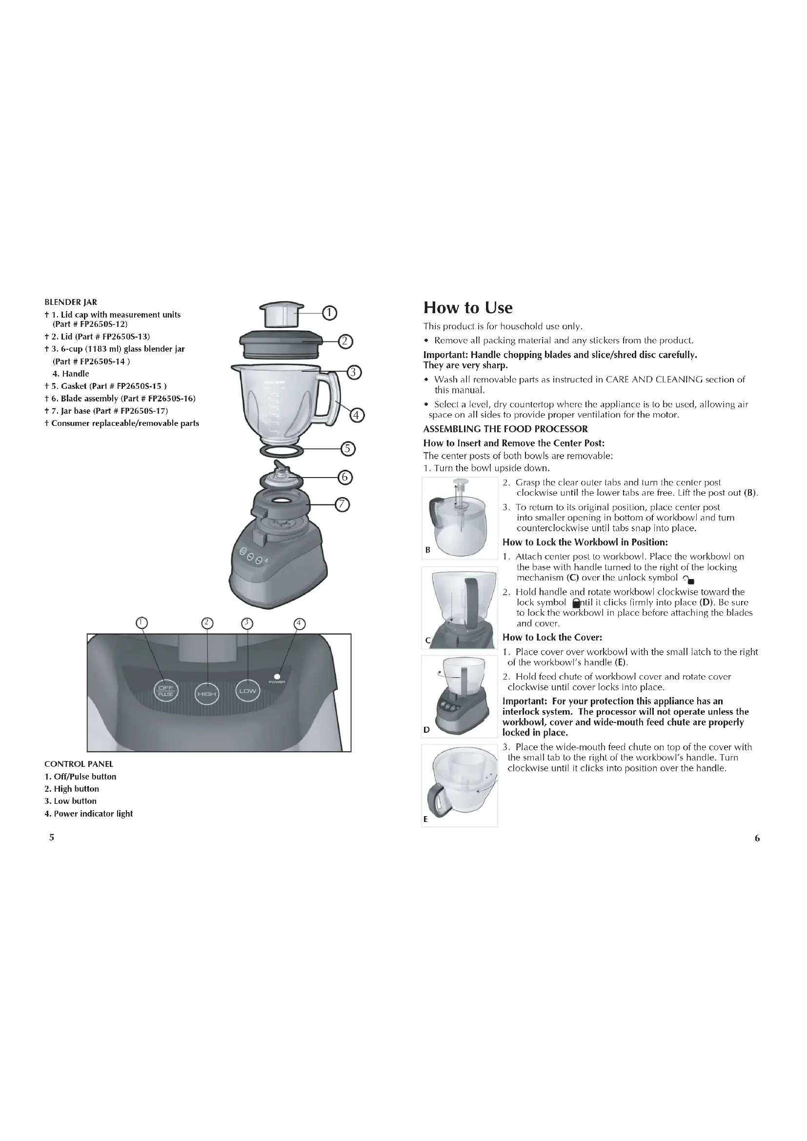BLENDERJAR †1.Lidcapwithmeasurementunits (Part#FP2650S-12) †2.Lid(Part#FP2650S-13) †3.6-cup(1183ml)glassblenderjar (Part#FP2650S-14) 4.Handle †5.Gasket(Part#FP2650S-15) †6.Bladeassembly(Part#FP2650S-16) †7.Jarbase(Part#FP2650S-17) †Consumerreplaceable/removableparts4. Insert the food pusher into the central tube of the wide-mouth feed chute. Turn clockwise to lock in place. The pusher is used to guide foods through the feed chute and can be removed when adding liquid or additional foods while the processor is running. To remove, turn counterclockwise. CONTROLS The controls are located on the front of the base (F). Press PULSE, HIGH or LOW to select a function (see directions below). OFF/PULSE: