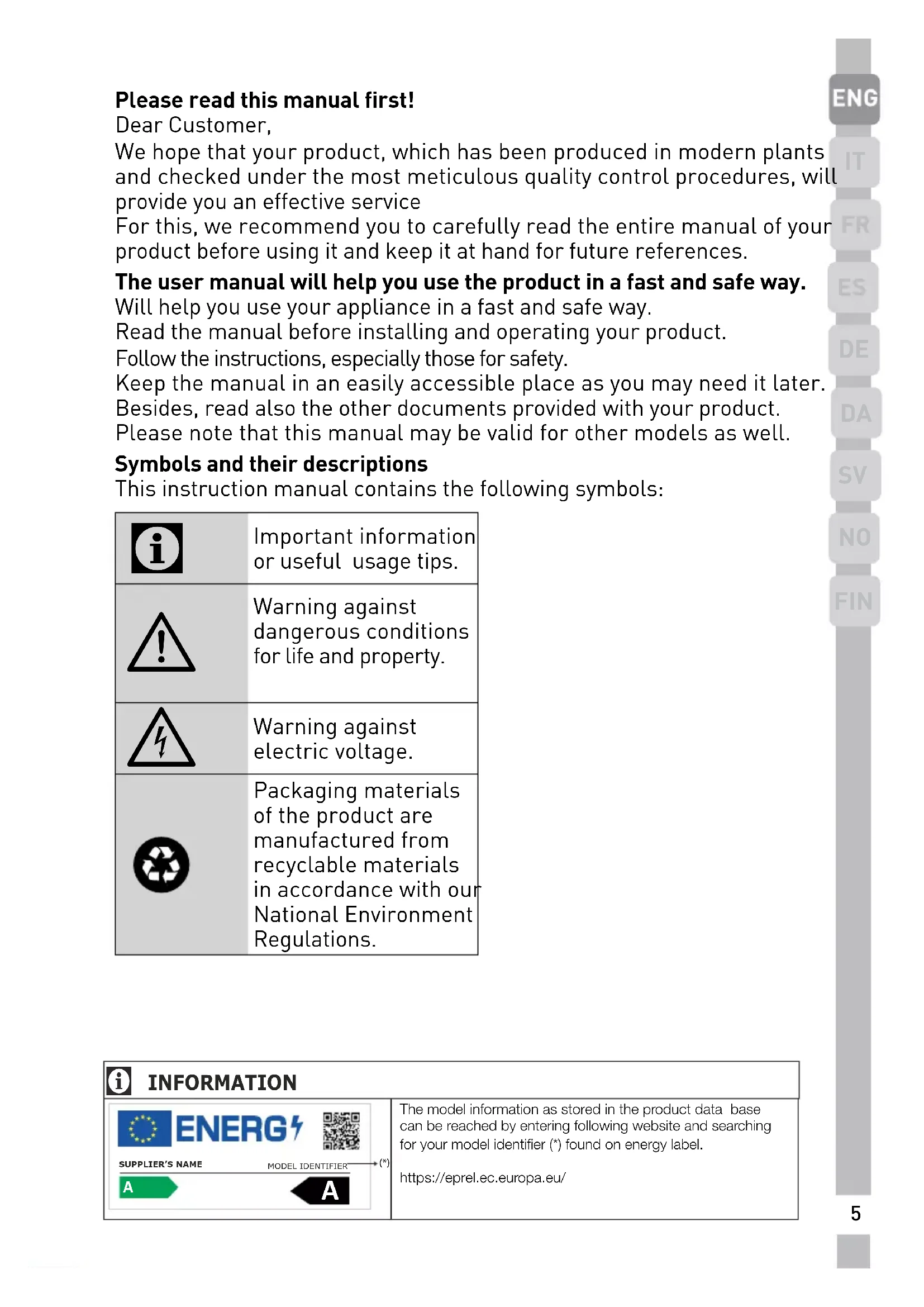FIN Please read this manual first! Dear Customer, We hope that your product, which has been produced in modern plants and checked under the most meticulous quality control procedures, will provide you an effective service For this, we recommend you to carefully read the entire manual of your product before using it and keep it at hand for future references. The user manual will help you use the product in a fast and safe way. Will help you use your appliance in a fast and safe way. Read the manual before installing and operating your product. Follow the instructions, especially those for safety. Keep the manual in an easily accessible place as you may need it later. Besides, read also the other documents provided with your product. Please note that this manual may be valid for other models as well. Symbols and their descriptions This instruction manual contains the following symbols: