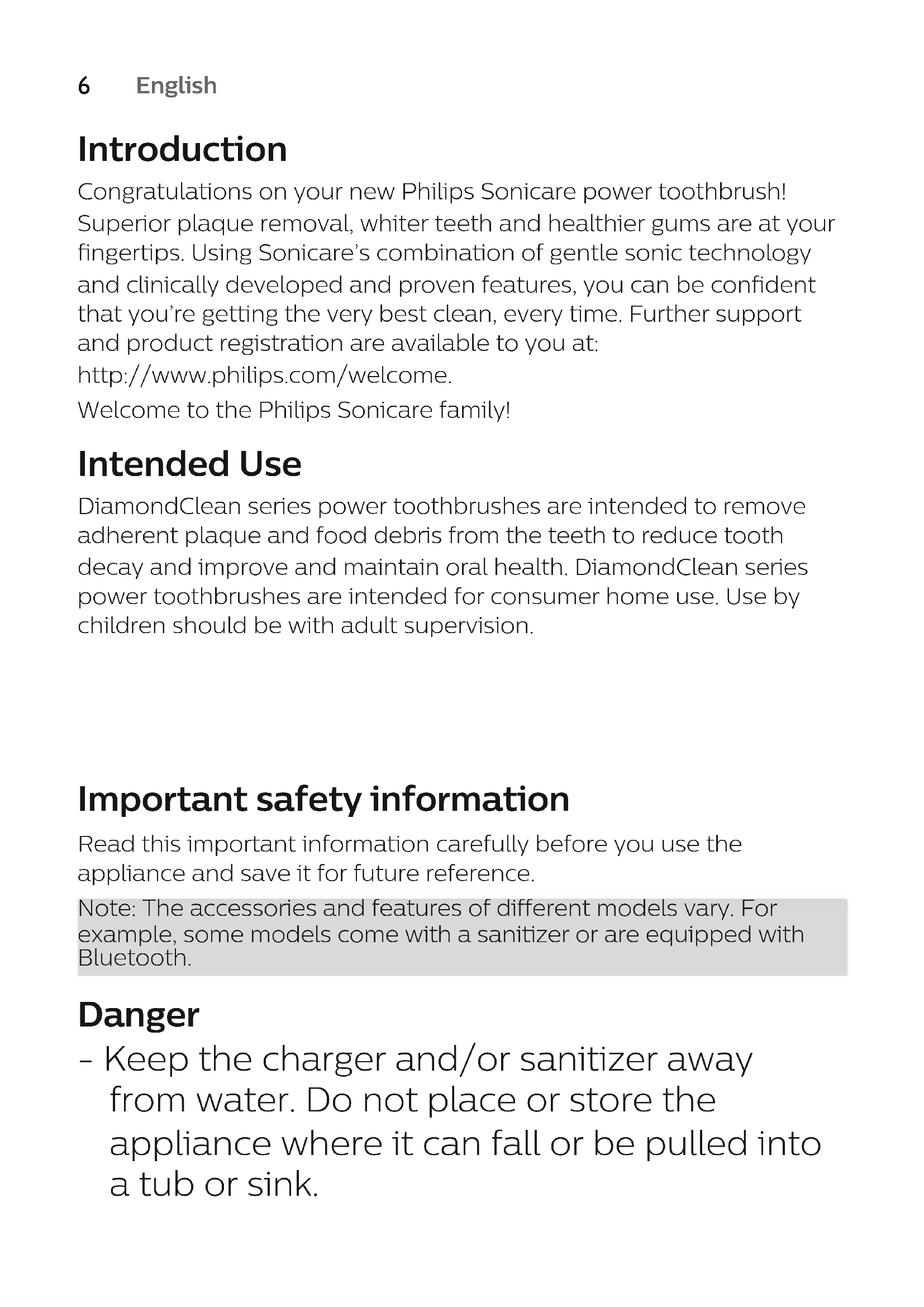 190English Introduction Congratulations on your new Philips Sonicare power toothbrush! Superior plaque removal, whiter teeth and healthier gums are at your fingertips. Using Sonicare’s combination of gentle sonic technology and clinically developed and proven features, you can be confident that you’re getting the very best clean, every time. Further support and product registration are available to you at: http://www.philips.com/welcome. Welcome to the Philips Sonicare family! Intended Use DiamondClean series power toothbrushes are intended to remove adherent plaque and food debris from the teeth to reduce tooth decay and improve and maintain oral health. DiamondClean series power toothbrushes are intended for consumer home use. Use by children should be with adult supervision. Important safety information Read this important information carefully before you use the appliance and save it for future reference. Note: The accessories and features of different models vary. For example, some models come with a sanitizer or are equipped with Bluetooth. Danger - Keep the charger and/or sanitizer away from water. Do not place or store the appliance where it can fall or be pulled into a tub or sink.