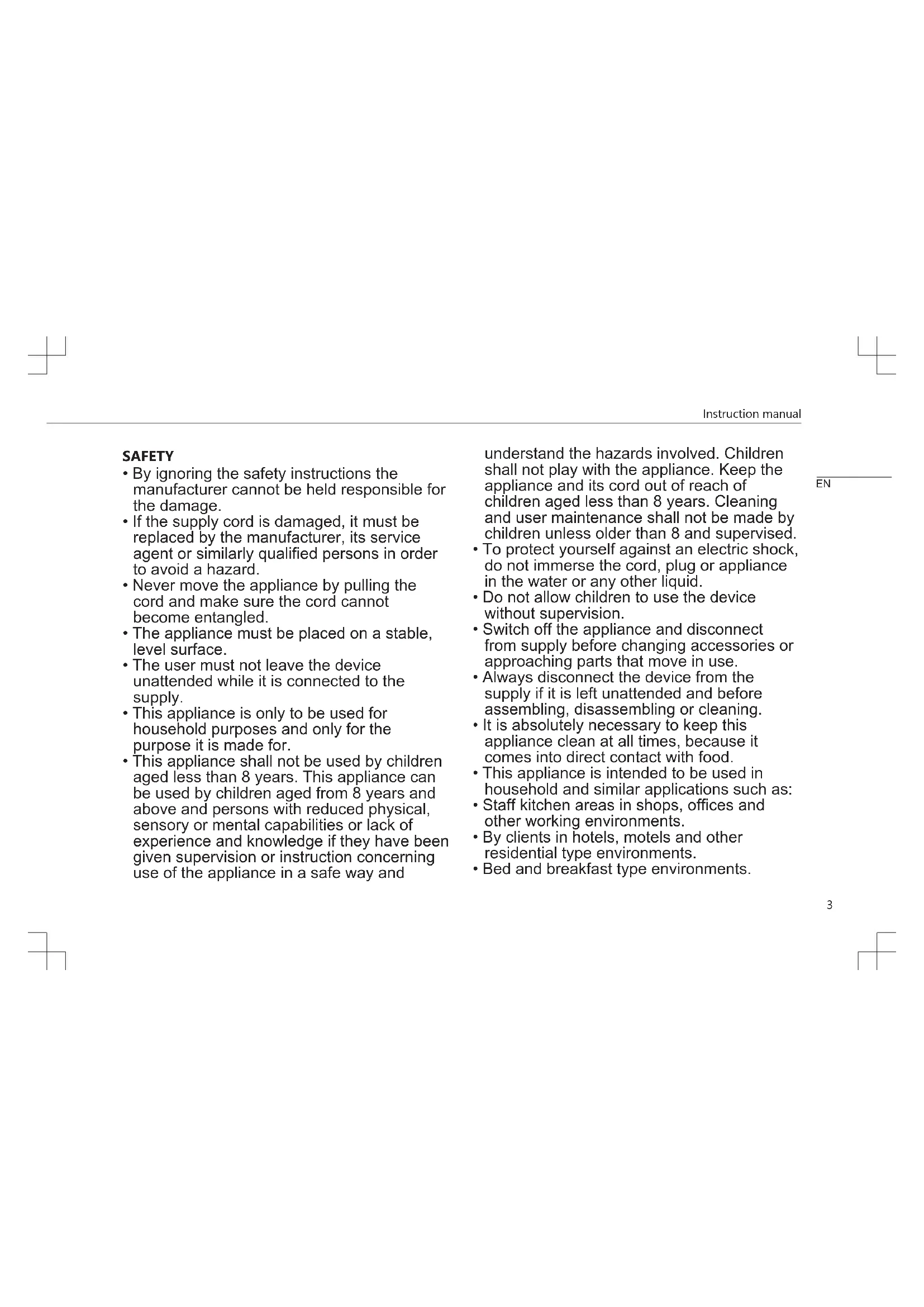 - The pressure section of the handle can be easily assembled for cleaning. ENVIRONMENT This appliance should not be put into the domestic garbage at the end of its durability, but must be offered at a central point for the recycling of electric and electronic domestic appliances. This symbolInstruction manual