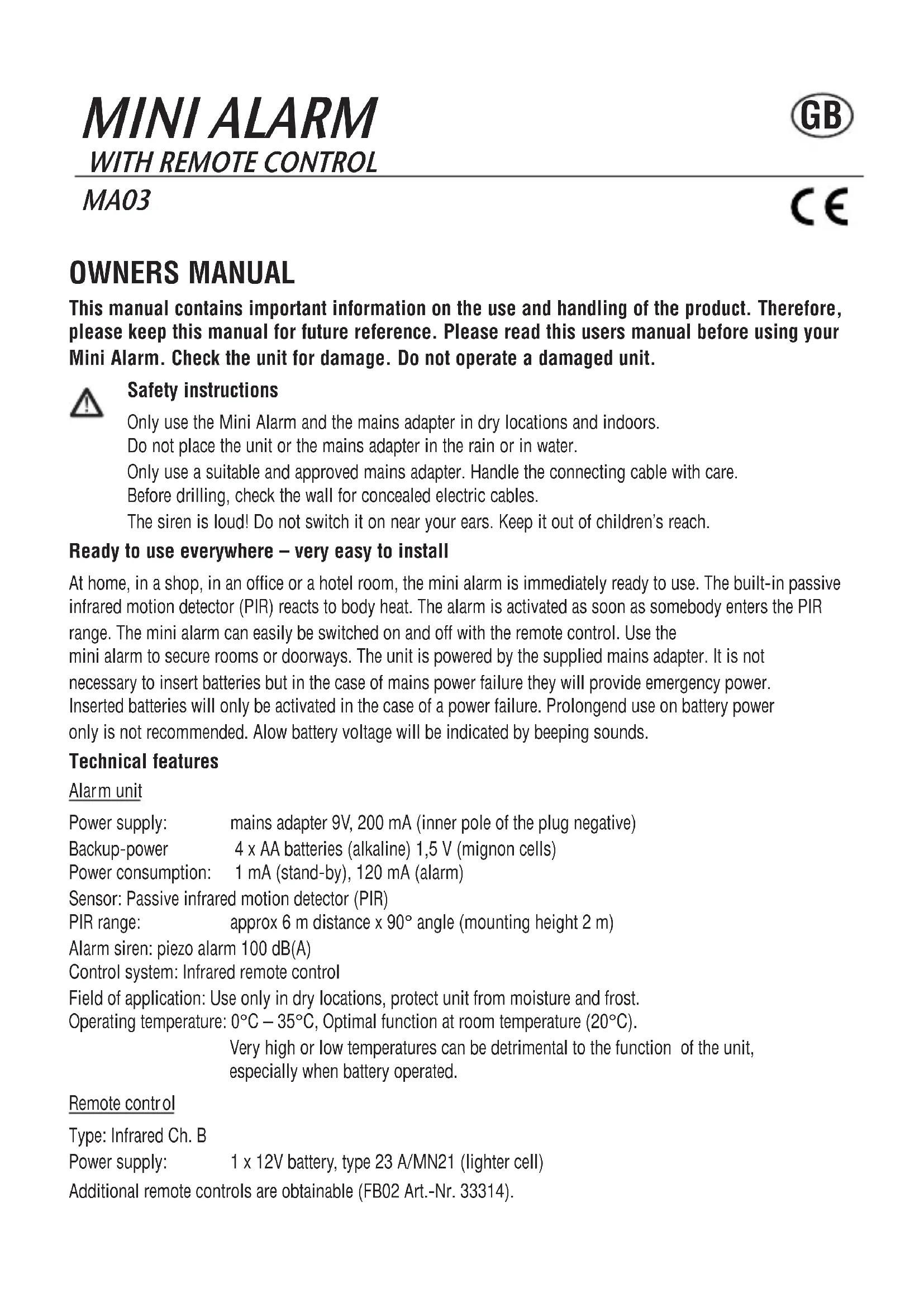 MA03Preparation for use (Fig. 1) Inser ting the batteries (alarm unit) Push the lid of the battery compartment down. Insert 4 pcs. AA batteries (alkaline). Check the polarity (+/-). Close the lid again. Inser ting the batteries (remote control) The battery has already been inserted by the manufacturer. To replace it, loosen the screw and remove the back part of the remote control. (Fig. 2) Replace the battery (type 23 A) and check the polarity (+/-). Connect the mains adapter Connect the DC-Jackplug in to the side of the unit. Then plug the mains adapter into a 230 V Socket.