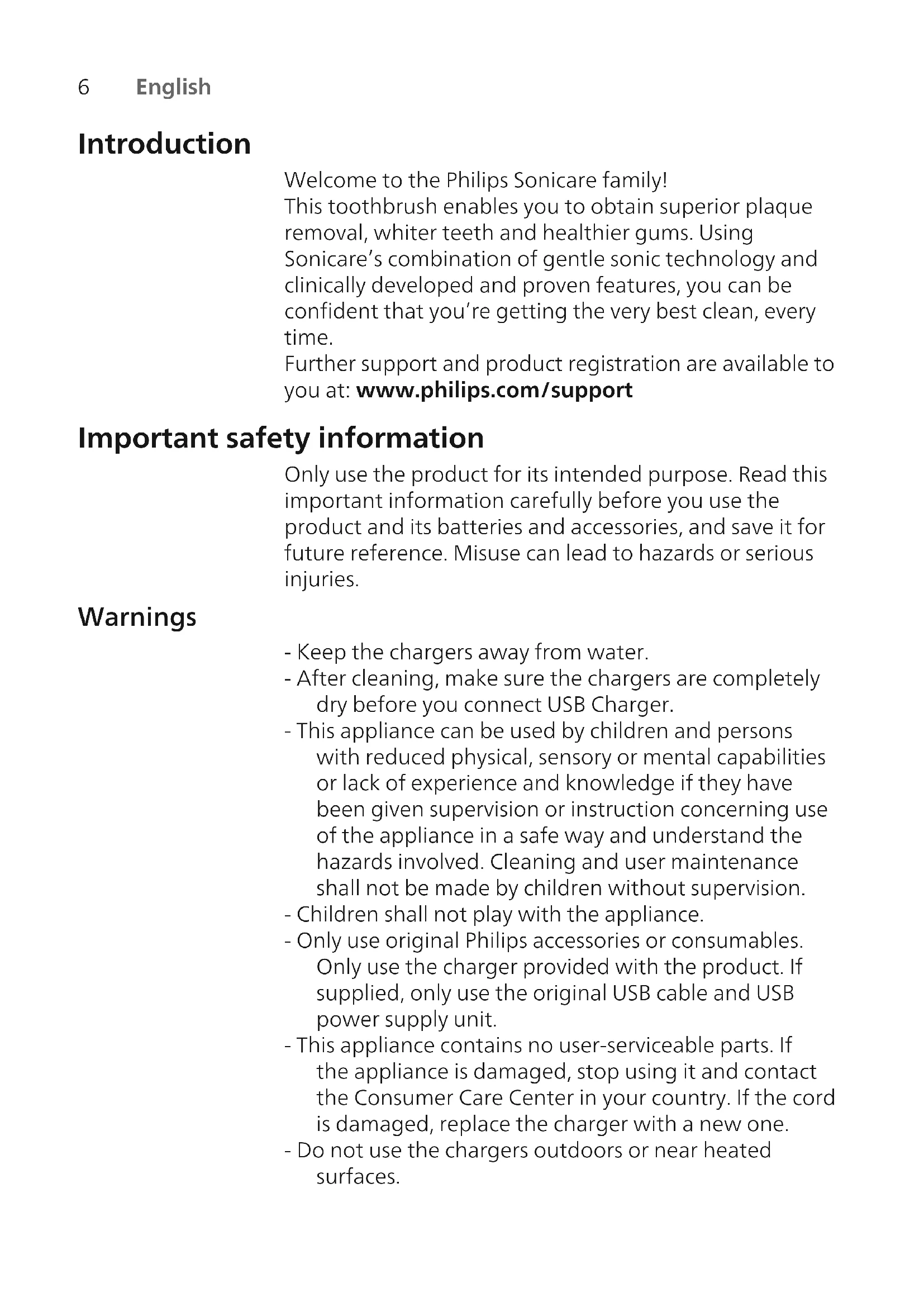 English Introduction Welcome to the Philips Sonicare family! This toothbrush enables you to obtain superior plaque removal, whiter teeth and healthier gums. Using Sonicare’s combination of gentle sonic technology and clinically developed and proven features, you can be confident that you’re getting the very best clean, every time. Further support and product registration are available to you at: www.philips.com/support Important safety information Only use the product for its intended purpose. Read this important information carefully before you use the product and its batteries and accessories, and save it for future reference. Misuse can lead to hazards or serious injuries. Warnings - Keep the chargers away from water. - After cleaning, make sure the chargers are completely dry before you connect USB Charger. - This appliance can be used by children and persons with reduced physical, sensory or mental capabilities or lack of experience and knowledge if they have been given supervision or instruction concerning use of the appliance in a safe way and understand the hazards involved. Cleaning and user maintenance shall not be made by children without supervision. - Children shall not play with the appliance. - Only use original Philips accessories or consumables. Only use the charger provided with the product. If supplied, only use the original USB cable and USB power supply unit. - This appliance contains no user-serviceable parts. If the appliance is damaged, stop using it and contact the Consumer Care Center in your country. If the cord is damaged, replace the charger with a new one. - Do not use the chargers outdoors or near heated surfaces.7 English - Do not clean any part of the product in the dishwasher. - This appliance has only been designed for cleaning teeth, gums and tongue. - Stop using a brush head with crushed or bent bristles. Replace the brush head every 3 months or sooner if signs of wear appear. - Avoid direct contact with products that contain essential oils or coconut oil. Contact may result in bristles dislodging. - Stop using the appliance and consult your dentist/doctor if excessive bleeding occurs after use, if bleeding continues to occur after 1 week of use or if you experience discomfort or pain. - If you have had oral or gum surgery in the previous 2 months, consult your dentist before you use this appliance. - If you have a pacemaker or other implanted device, contact your doctor or the manufacturer of the implanted device prior to use. - If you have medical concerns, consult your doctor before you use this appliance. - This appliance is a personal care device and is not intended for use on multiple patients in a dental practice or institution. Battery safety instructions - This appliance contains batteries that are only to be removed by skilled persons - Only use the product for its intended purpose. Read this information carefully before you use the product and its batteries and accessories, and save it for future reference. Misuse can lead to hazards or serious injuries. Accessories supplied may vary for different products. - Only use original Philips accessories and consumables. Only use detachable supply unit CBAyyyy, TCAxxxx, or WAAxxxx. - Keep product and batteries away from fire and do not expose them to direct sunlight or high temperatures.8 English - If the product becomes abnormally hot or smelly, changes color or if charging takes longer than usual, stop using and charging the product and contact Philips. - Do not place products and their batteries in microwave ovens or on induction cookers. - Do not open, modify, pierce, damage or dismantle the product or battery to prevent batteries from heating up or releasing toxic or hazardous substances. Do not short-circuit, overcharge or reverse charge batteries. - This appliance contains batteries that are non- replaceable. When the battery is at end of life, the appliance shall be properly disposed of, see section on recycling. - If batteries are damaged or leaking, avoid contact with the skin or eyes. If this occurs, immediately rinse well with water and seek medical care. - When you handle batteries, make sure that your hands, the product and the batteries are dry. - To avoid accidental short-circuiting of batteries after removal, do not let battery terminals come into contact with metal object (e.g. coins, hairpins, rings). Do not wrap batteries in aluminium foil. Tape battery terminals or put batteries in a plastic bag before you discard them. - Charge and use the product at a temperature between 0 °C and 40 °C (32°F and 104 °F). Storage and transportation conditions Temperature -10°C to 60°C (14°F to 140°F). Electromagnetic fields (EMF) This Philips appliance complies with all applicable standards and regulations regarding exposure to electromagnetic fields. Radio Equipment Directive Hereby, Philips declares that electric toothbrushes with radio equipment type (Bluetooth, NFC) are in compliance with Directive 2014/53/EU. - The Bluetooth radio frequency interface in applicable products operates at 2.4 GHz.9 English - The maximum output power by the Bluetooth appliance is 3 dBm. - The NFC radio frequency interface in applicable products operates at 13.56 MHz. - The maximum RF power transmitted by the appliance is 30.16 dBm. The full text of the EU declaration of conformity is available at the following internet address: www.philips.com/support Note: The Features of different models may vary. Some models may not be equipped with Bluetooth or NFC. Intended use Sonicare DiamondClean Smart power toothbrushes are intended to remove adherent plaque and food debris from the teeth to reduce tooth decay and improve and maintain oral health. Sonicare DiamondClean Smart power toothbrushes are intended for personal use. Use by children should be with adult supervision. Your Philips Sonicare (Fig 1.) 1 Handle 2 Power on/off button 3 Intensity indicator 4 Mode/intensity button 5 Mode indicator 6 Brush he
