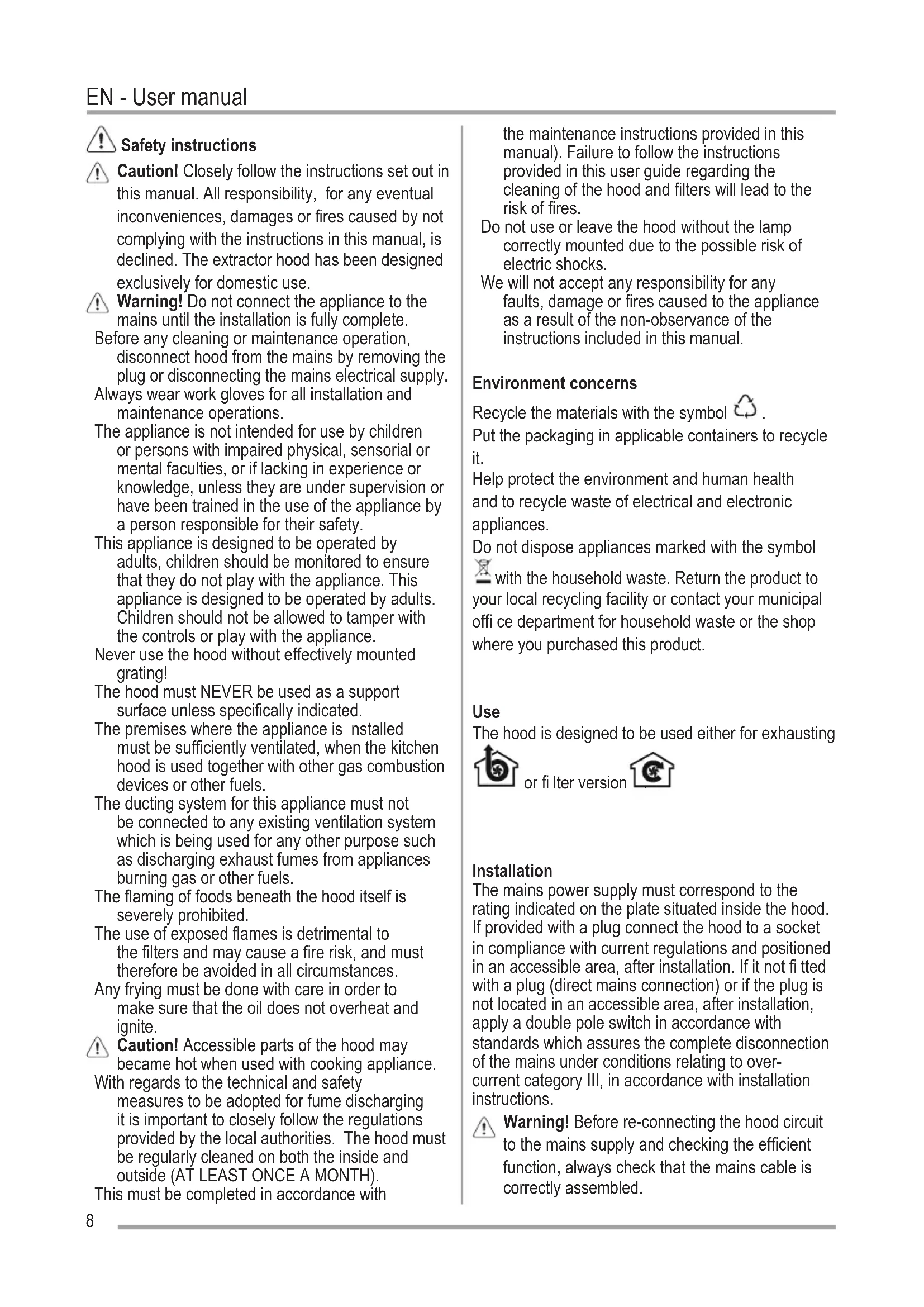 Safety instructions Caution! Closely follow the instructions set out in this manual. All responsibility, for any eventual inconveniences, damages or fires caused by not complying with the instructions in this manual, is declined. The extractor hood has been designed exclusively for domestic use. Warning! Do not connect the appliance to the mains until the installation is fully complete. Before any cleaning or maintenance operation, disconnect hood from the mains by removing the plug or disconnecting the mains electrical supply. Always wear work gloves for all installation and maintenance operations. The appliance is not intended for use by children or persons with impaired physical, sensorial or mental faculties, or if lacking in experience or knowledge, unless they are under supervision or have been trained in the use of the appliance by a person responsible for their safety. This appliance is designed to be operated by adults, children should be monitored to ensure that they do not play with the appliance. This appliance is designed to be operated by adults. Children should not be allowed to tamper with the controls or play with the appliance. Never use the hood without effectively mounted grating! The hood must NEVER be used as a support surface unless specifically indicated. The premises where the appliance is nstalled must be sufficiently ventilated, when the kitchen hood is used together with other gas combustion devices or other fuels. The ducting system for this appliance must not be connected to any existing ventilation system which is being used for any other purpose such as discharging exhaust fumes from appliances burning gas or other fuels. The flaming of foods beneath the hood itself is severely prohibited. The use of exposed flames is detrimental to the filters and may cause a fire risk, and must therefore be avoided in all circumstances. Any frying must be done with care in order to make sure that the oil does not overheat and ignite. Caution! Accessible parts of the hood may became hot when used with cooking appliance. With regards to the technical and safety measures to be adopted for fume discharging it is important to closely follow the regulations provided by the local authorities. The hood must be regularly cleaned on both the inside and outside (AT LEAST ONCE A MONTH). This must be completed in accordance with the maintenance instructions provided in this manual). Failure to follow the instructions provided in this user guide regarding the cleaning of the hood and filters will lead to the risk of fires. Do not use or leave the hood without the lamp correctly mounted due to the possible risk of electric shocks. We will not accept any responsibility for any faults, damage or fires caused to the appliance as a result of the non-observance of the instructions included in this manual. Environment concerns Recycle the materials with the symbol