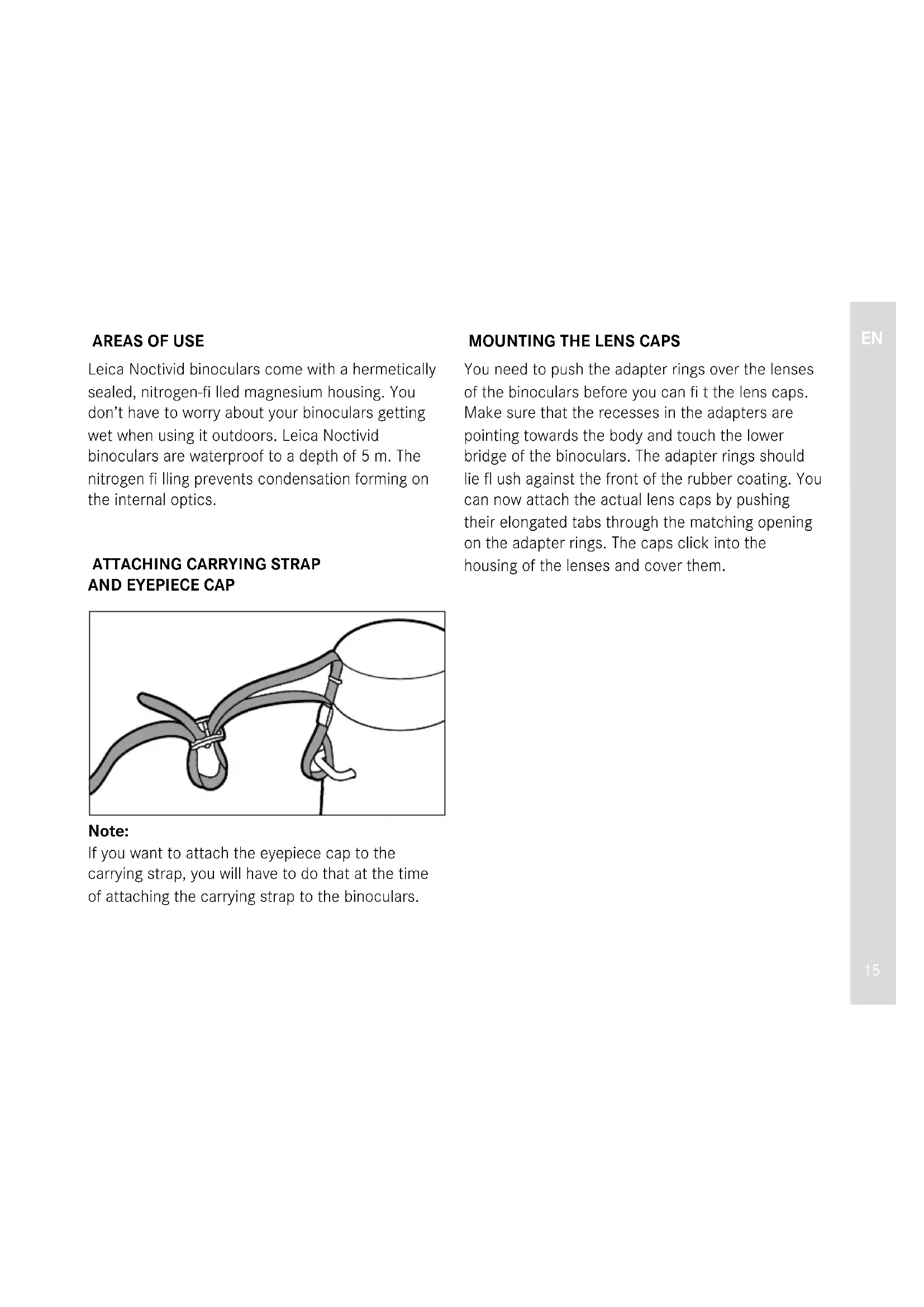 ACCESSORIES Please visit the Leica Camera AG website for information on the extensive range of accessories for Leica Noctivid binoculars: www.leica-camera.com SPARE PARTS Please contact our Customer Care department or your national Leica representative if you ever need spare parts like eyecups, caps or carrying straps. The relevant addresses are listed on your Guarantee Card.EN