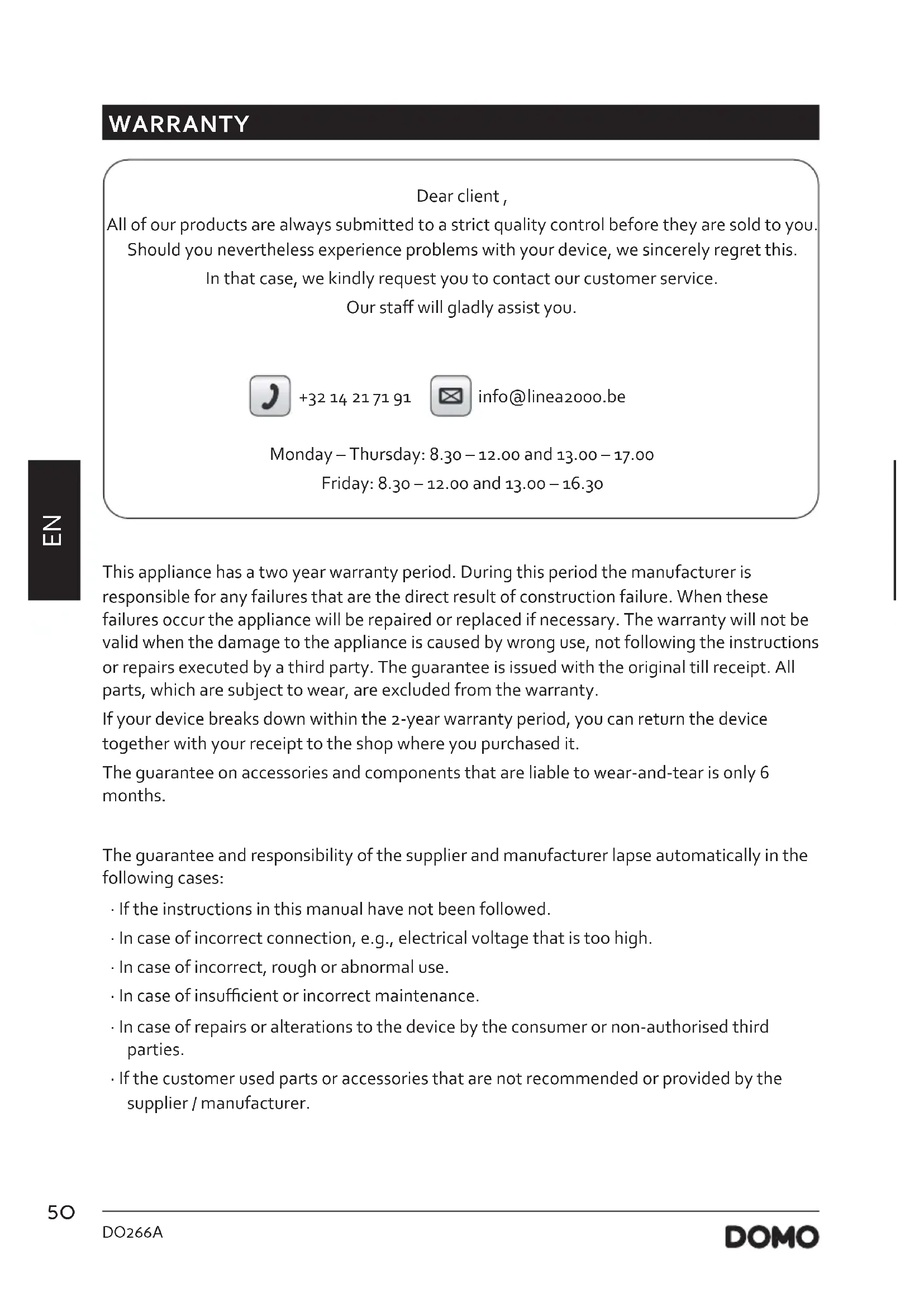 WARRANTY Dear client , All of our products are always submitted to a strict quality control before they are sold to you. Should you nevertheless experience problems with your device, we sincerely regret this. In that case, we kindly request you to contact our customer service. Our sta will gladly assist you. +32 14 21 71 91 info@linea2000.be Monday – Thursday: 8.30 – 12.00 and 13.00 – 17.00 Friday: 8.30 – 12.00 and 13.00 – 16.30 This appliance has a two year warranty period. During this period the manufacturer is responsible for any failures that are the direct result of construction failure. When these failures occur the appliance will be repaired or replaced if necessary. The warranty will not be valid when the damage to the appliance is caused by wrong use, not following the instructions or repairs executed by a third party. The guarantee is issued with the original till receipt. All parts, which are subject to wear, are excluded from the warranty. If your device breaks down within the 2-year warranty period, you can return the device together with your receipt to the shop where you purchased it. The guarantee on accessories and components that are liable to wear-and-tear is only 6 months. The guarantee and responsibility of the supplier and manufacturer lapse automatically in the following cases: