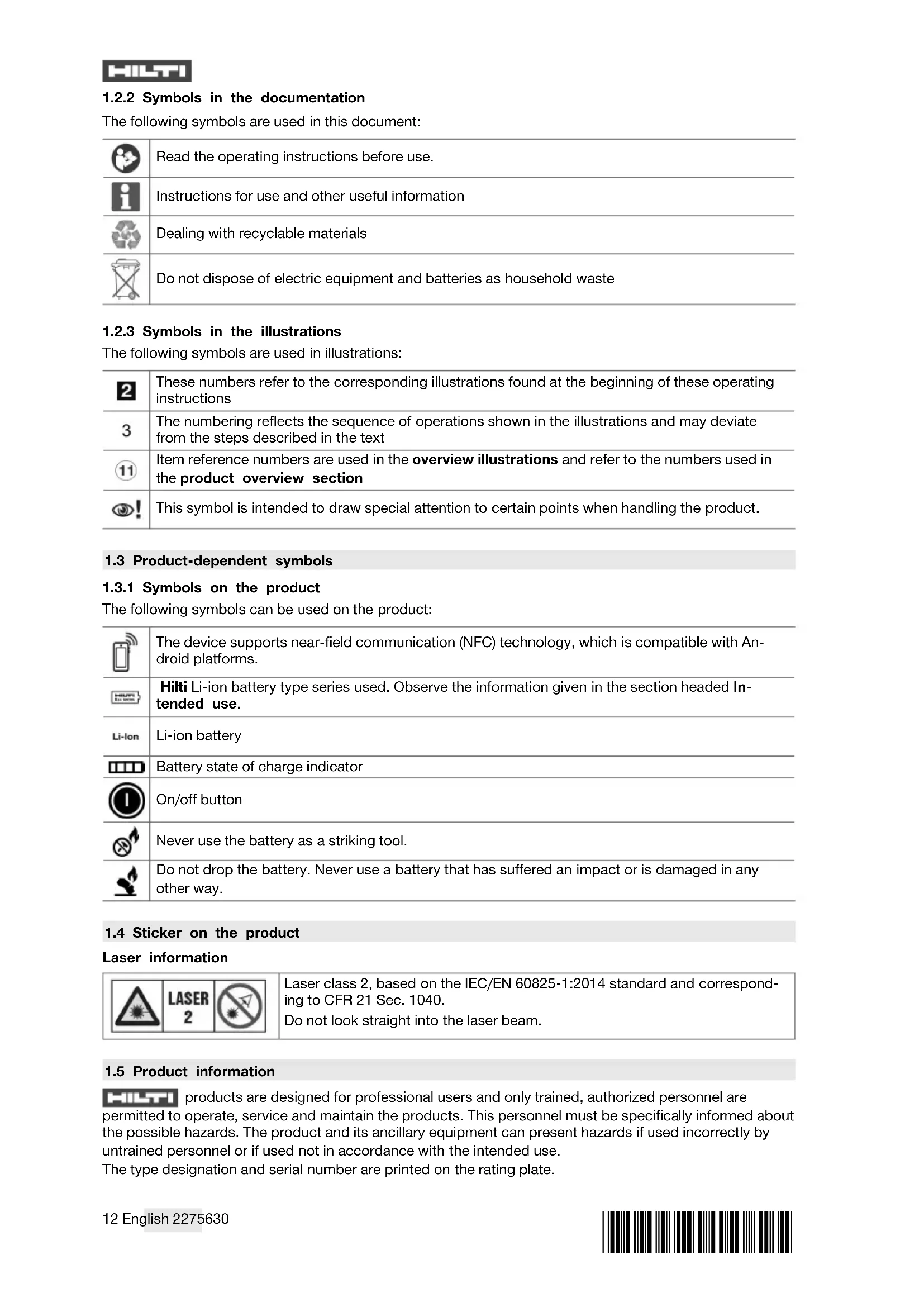 products are designed for professional users and only trained, authorized personnel are permitted to operate, service and maintain the products. This personnel must be specifically informed about the possible hazards. The product and its ancillary equipment can present hazards if used incorrectly by untrained personnel or if used not in accordance with the intended use. The type designation and serial number are printed on the rating plate.*2275630* 2275630 English 13 ▶ Write down the serial number in the table below. You will be required to state the product details when contacting Hilti Service or your local Hilti organization to inquire about the product. Product information Layout tool PMD 200 Generation 01 Serial no.
