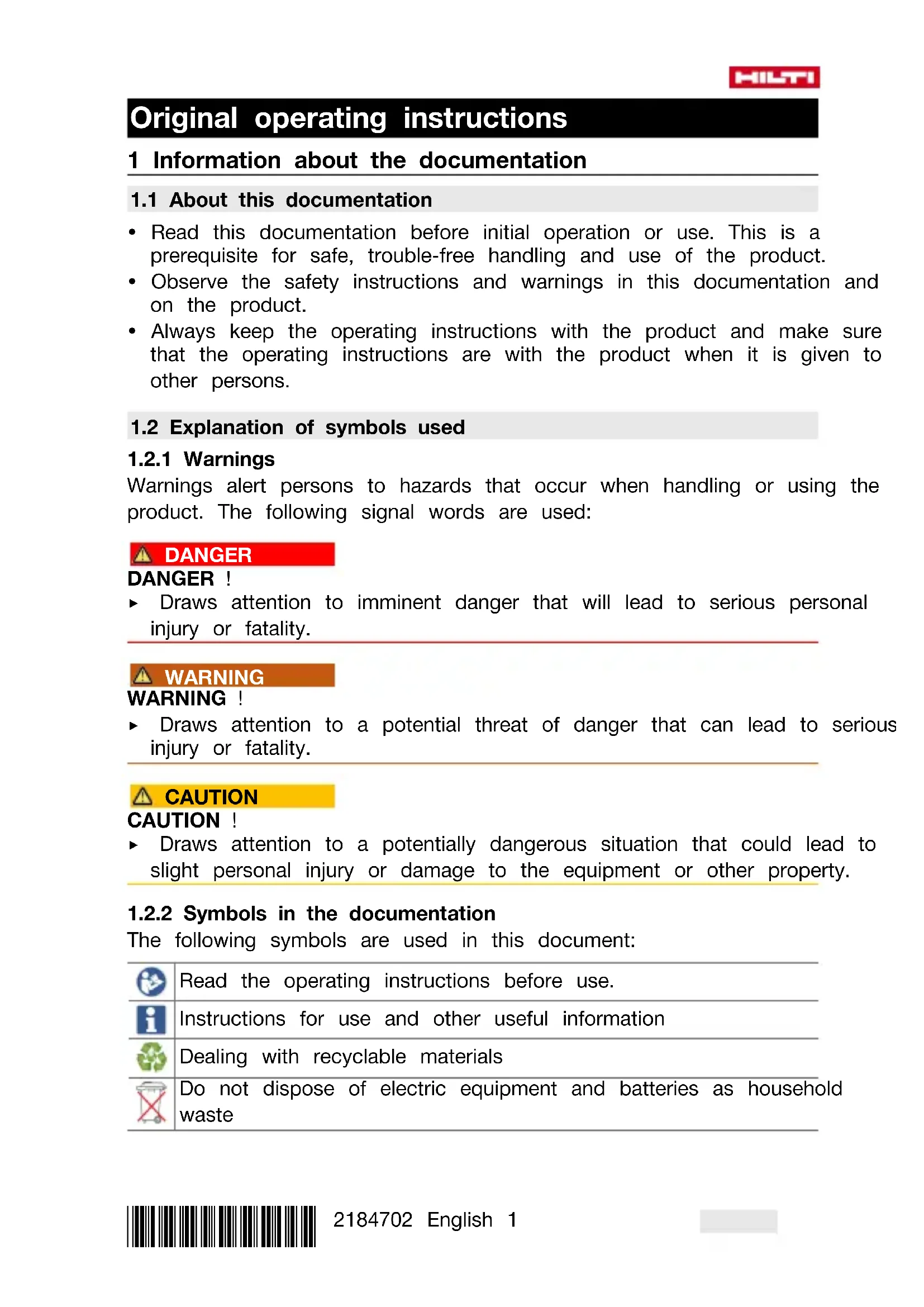 The following symbols are used in this document: Read the operating instructions before use. Instructions for use and other useful information Dealing with recyclable materials Do not dispose of electric equipment and batteries as household waste2 English 2184702 *2184702*
