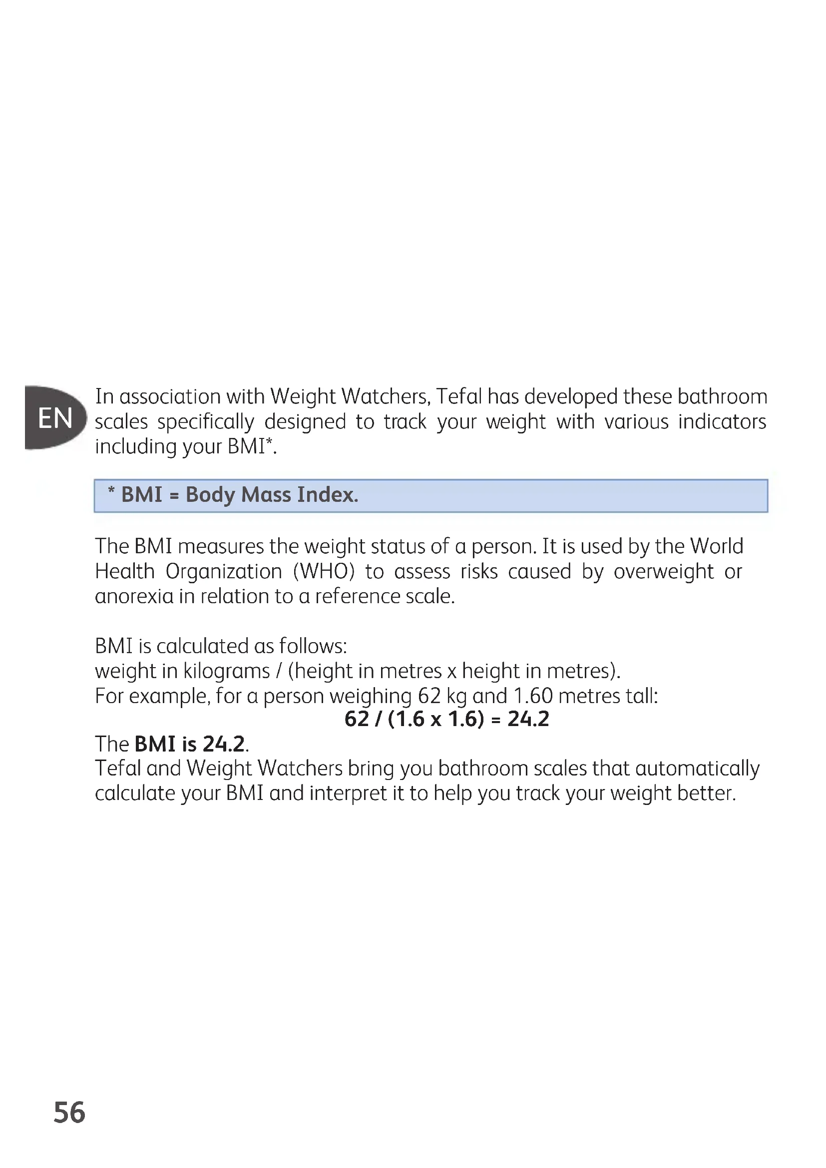 - BMI = Body Mass Index. The BMI measures the weight status of a person. It is used by the World Health Organization (WHO) to assess risks caused by overweight or anorexia in relation to a reference scale. BMI is calculated as follows: weight in kilograms / (height in metres x height in metres). For example, for a person weighing 62 kg and 1.60 metres tall: 62 / (1.6 x 1.6) = 24.2 The BMI is 24.2. Tefal and Weight Watchers bring you bathroom scales that automatically calculate your BMI and interpret it to help you track your weight better. TefWW-PPBodymaster 03-11 29/03/11 14:38 Page 56FR