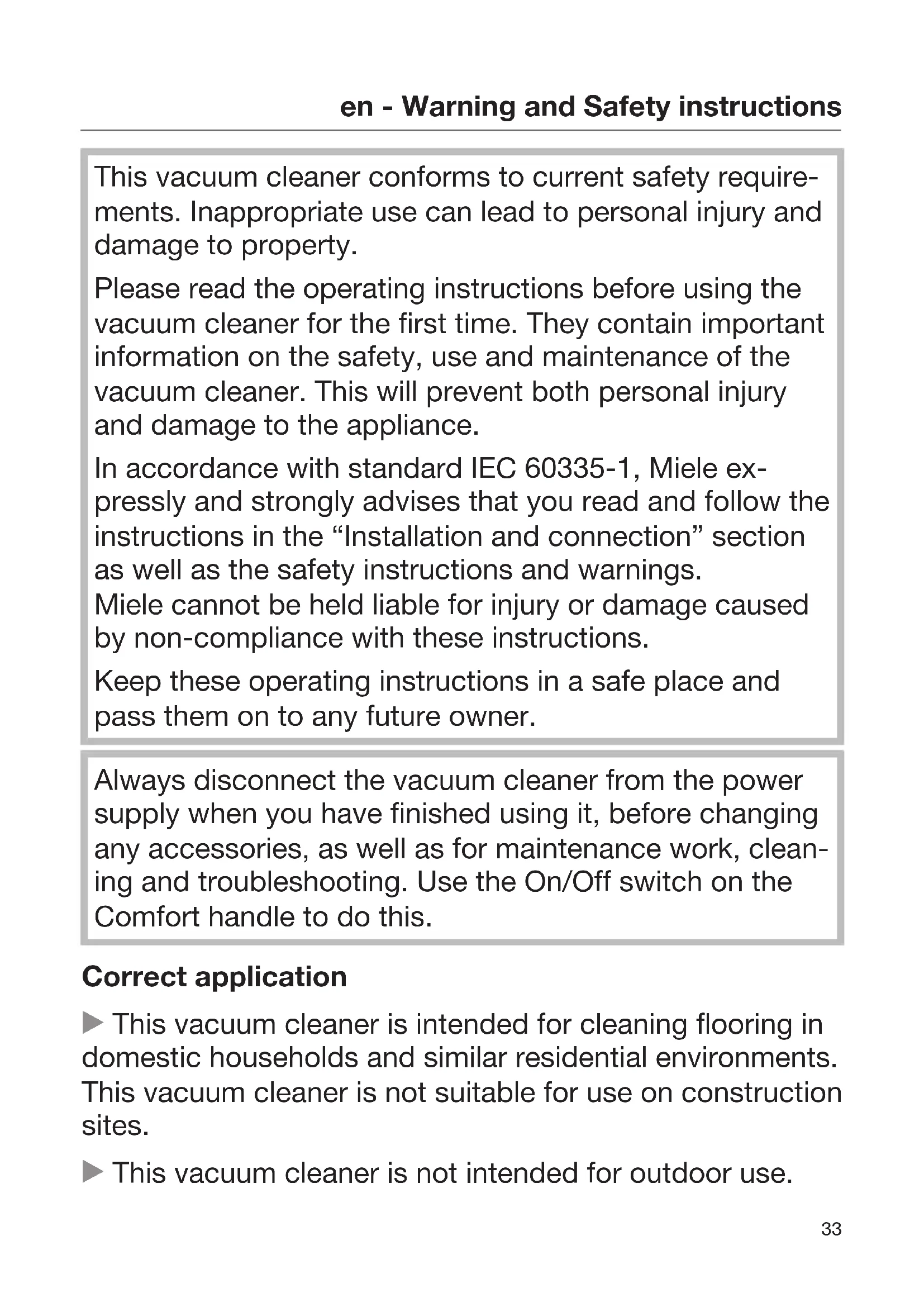 This vacuum cleaner conforms to current safety require- ments. Inappropriate use can lead to personal injury and damage to property. Please read the operating instructions before using the vacuum cleaner for the first time. They contain important information on the safety, use and maintenance of the vacuum cleaner. This will prevent both personal injury and damage to the appliance. In accordance with standard IEC60335-1, Miele ex- pressly and strongly advises that you read and follow the instructions in the “Installation and connection” section as well as the safety instructions and warnings. Miele cannot be held liable for injury or damage caused by non-compliance with these instructions. Keep these operating instructions in a safe place and pass them on to any future owner. Always disconnect the vacuum cleaner from the power supply when you have finished using it, before changing any accessories, as well as for maintenance work, clean- ing and troubleshooting. Use the On/Off switch on the Comforthandle to do this. Correct application This vacuum cleaner is intended for cleaning flooring in domestic households and similar residential environments. This vacuum cleaner is not suitable for use on construction sites. This vacuum cleaner is not intended for outdoor use.en - Warning and Safety instructions