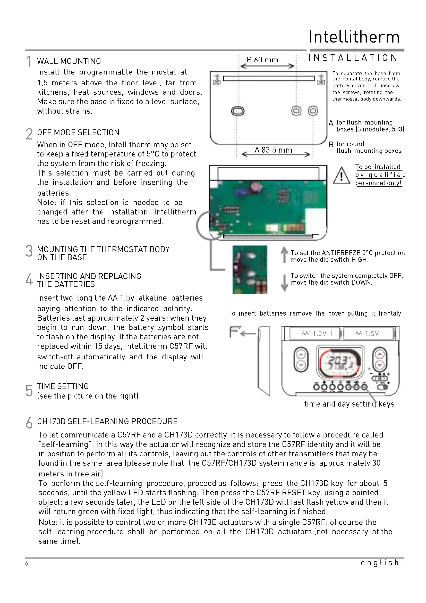 OFF MODE SELECTIONWhen in OFF mode, Intellitherm may be set to keep a fixed temperature of 5°C to protect the system from the risk of freezing. This selection must be carried out during the installation and before inserting the batteries.Note: if this selection is needed to be changed after the installation, Intellitherm has to be reset and reprogrammed.To set the ANTIFREEZE 5°C protection move the dip switch HIGH.To switch the system completely OFF, move the dip switch DOWN. WALL MOUNTINGTo be installed b y q u a li f i e d personnel only!Install the programmable thermostat at 1,5 meters above the floor level, far from kitchens, heat sources, windows and doors. Make sure the base is fixed to a level surface, without strains. for flush-mounting boxes (3 modules, 503)for round flush-mounting boxes