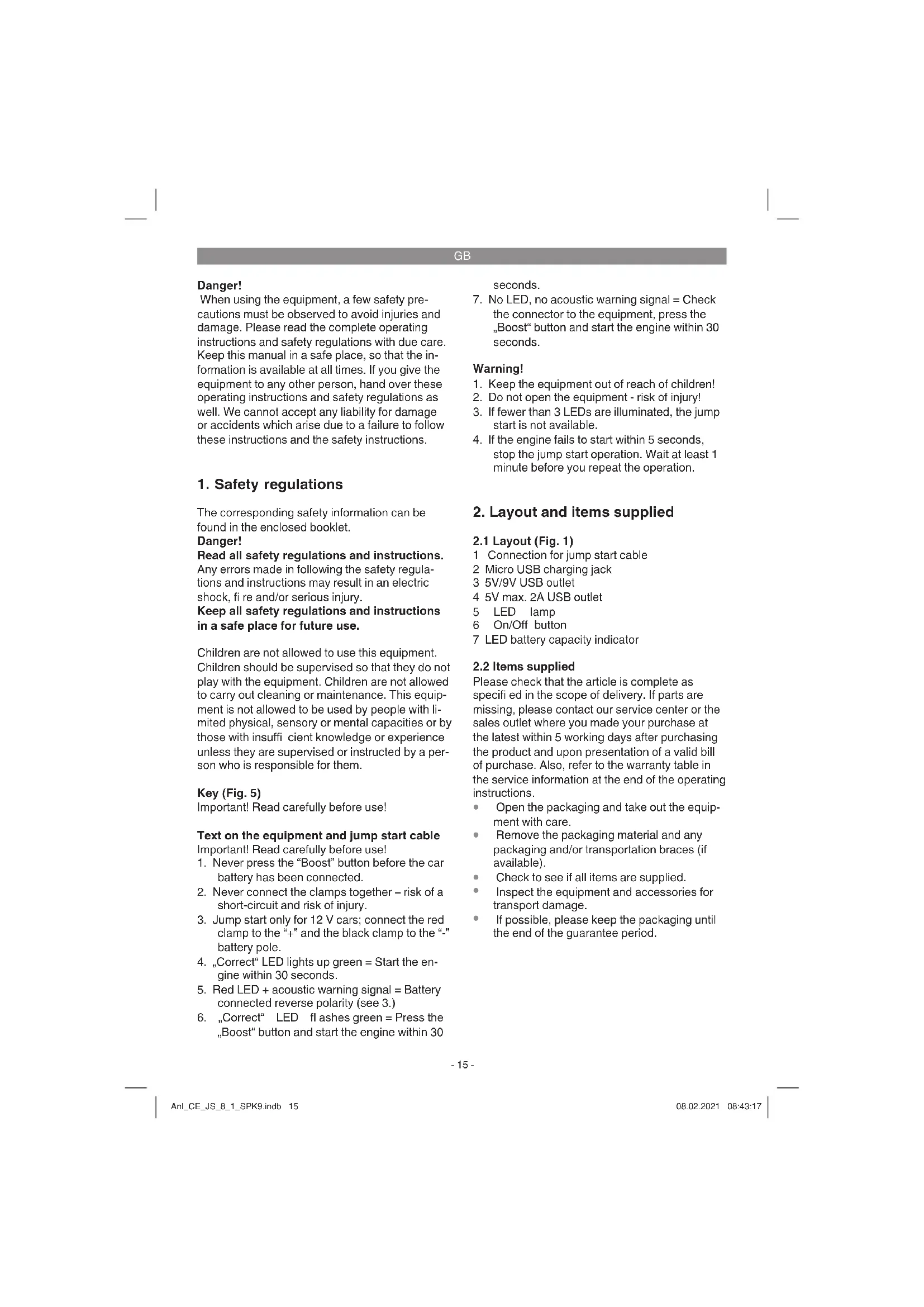 The corresponding safety information can be found in the enclosed booklet. Danger! Read all safety regulations and instructions. Any errors made in following the safety regula- tions and instructions may result in an electric shock, fi re and/or serious injury. Keep all safety regulations and instructions in a safe place for future use. Children are not allowed to use this equipment. Children should be supervised so that they do not play with the equipment. Children are not allowed to carry out cleaning or maintenance. This equip- ment is not allowed to be used by people with li- mited physical, sensory or mental capacities or by those with insuffi cient knowledge or experience unless they are supervised or instructed by a per- son who is responsible for them. Key (Fig. 5) Important! Read carefully before use! Text on the equipment and jump start cable Important! Read carefully before use!