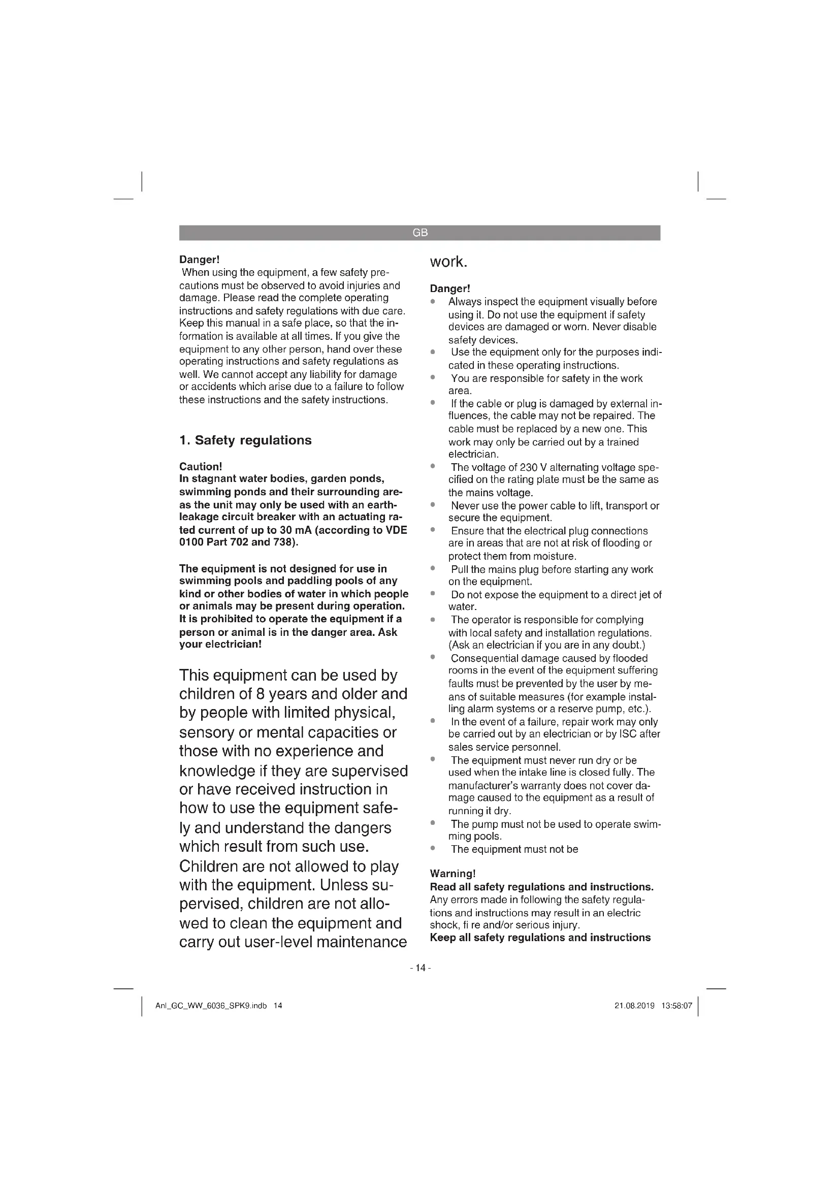 Caution! In stagnant water bodies, garden ponds, swimming ponds and their surrounding are- as the unit may only be used with an earth- leakage circuit breaker with an actuating ra- ted current of up to 30 mA (according to VDE 0100 Part 702 and 738). The equipment is not designed for use in swimming pools and paddling pools of any kind or other bodies of water in which people or animals may be present during operation. It is prohibited to operate the equipment if a person or animal is in the danger area. Ask your electrician! This equipment can be used by children of 8 years and older and by people with limited physical, sensory or mental capacities or those with no experience and knowledge if they are supervised or have received instruction in how to use the equipment safe- ly and understand the dangers which result from such use. Children are not allowed to play with the equipment. Unless su- pervised, children are not allo- wed to clean the equipment and carry out user-level maintenance work. Danger!