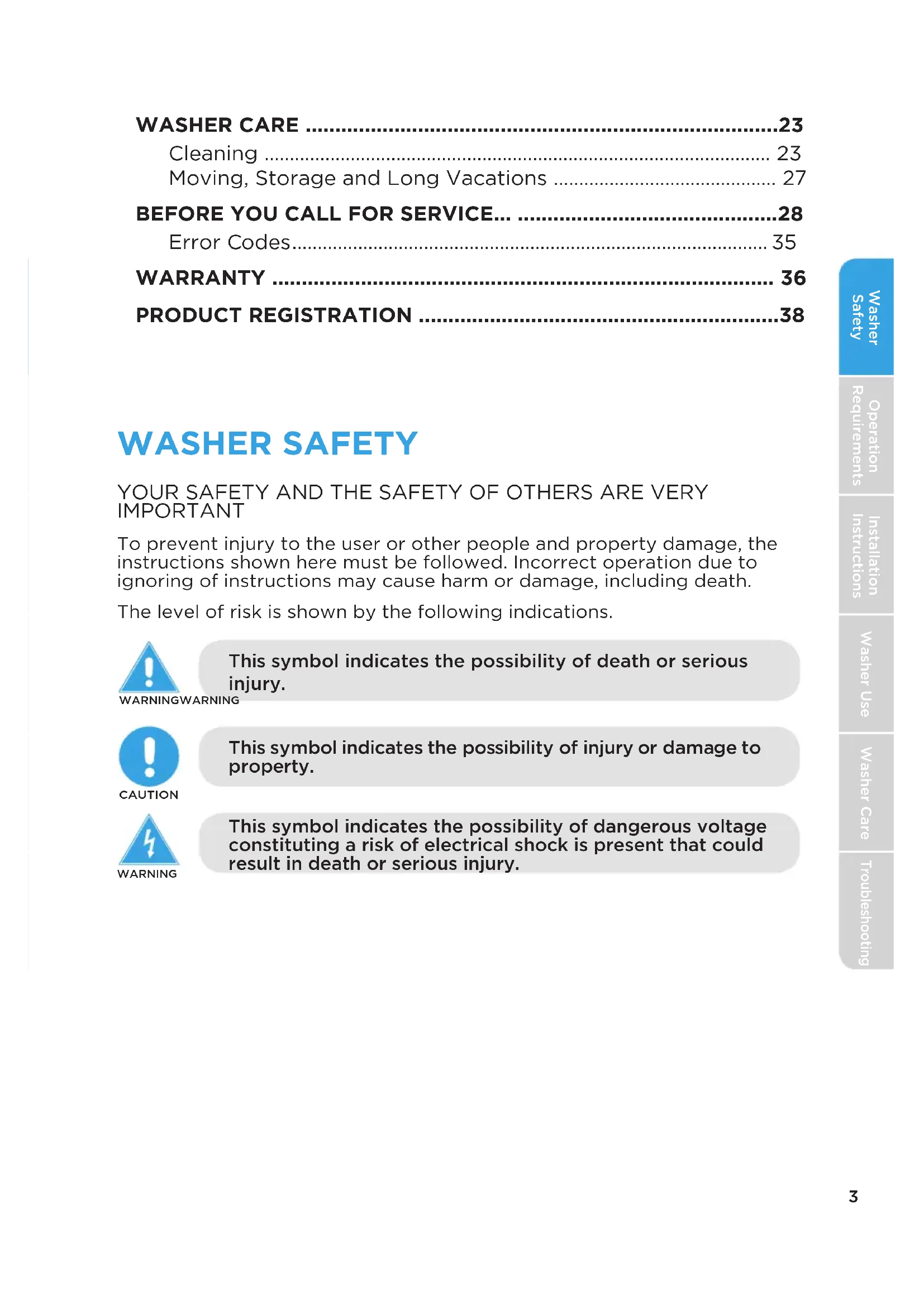Error Codes .............................................................................................. 35 WARRANTY ..................................................................................... 36 PRODUCT REGISTRATION .............................................................38 WASHER SAFETY YOUR SAFETY AND THE SAFETY OF OTHERS ARE VERY IMPORTANT To prevent injury to the user or other people and property damage, the instructions shown here must be followed. Incorrect operation due to ignoring of instructions may cause harm or damage, including death. The level of risk is shown by the following indications. CAUTIONWARNINGWARNING WARNING This symbol indicates the possibility of dangerous voltage constituting a risk of electrical shock is present that could result in death or serious injury. This symbol indicates the possibility of injury or damage to property. This symbol indicates the possibility of death or serious injury.4 Washer SafetyOperation RequirementsInstallation InstructionsWasher UseWasher CareTroubleshooting