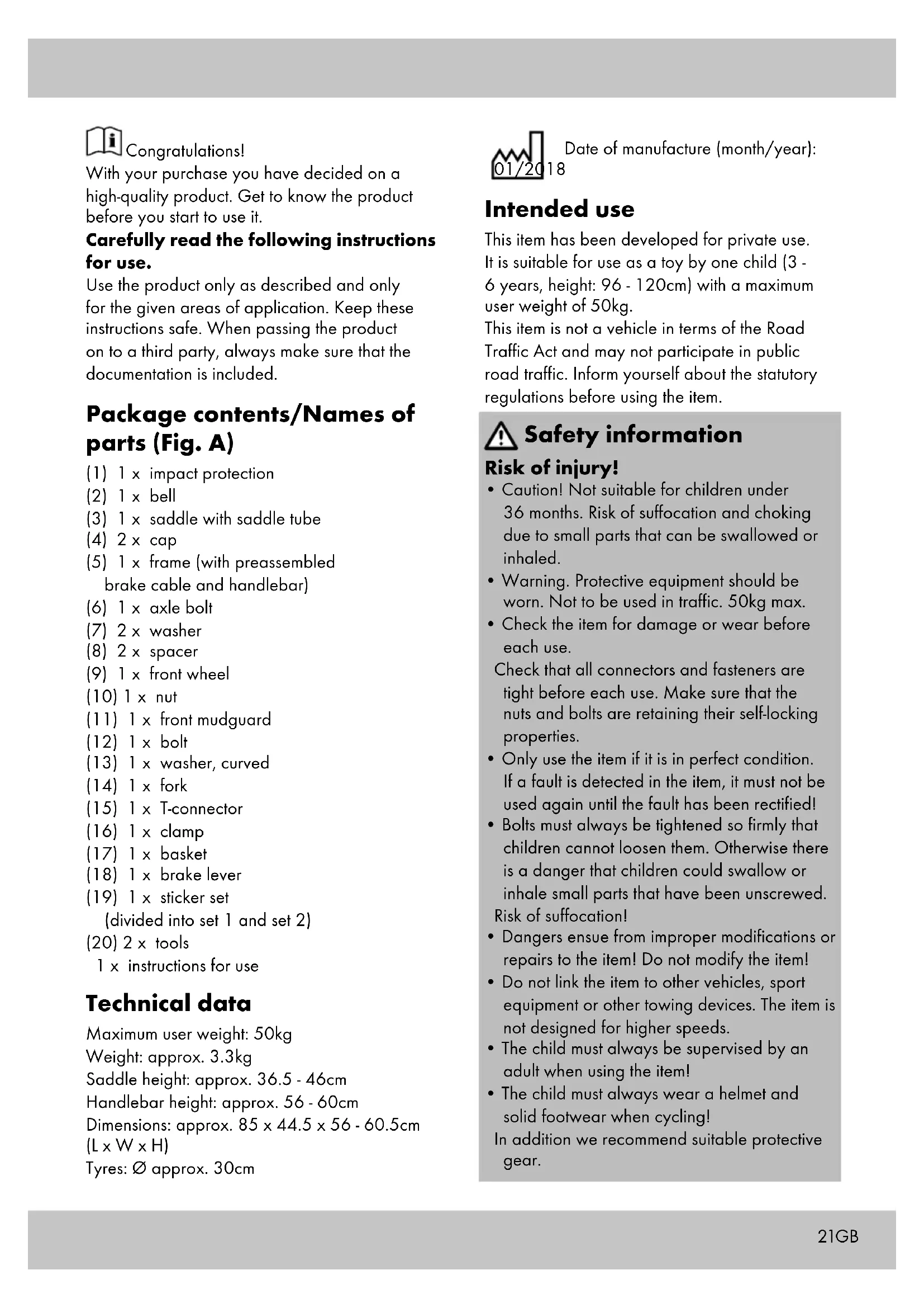- There is a danger of slipping on slick surfaces! Bear in mind that there is always the danger of a fall when the item is being used. Assembly CAUTION! Assembly of the item must always be carried out by an adult! CAUTION! Keep children away from the item and the packaging materials during assembly. Risk of suffocation and choking due to small parts that can be swallowed or inhaled and risk of suffocation due to plastic bags.