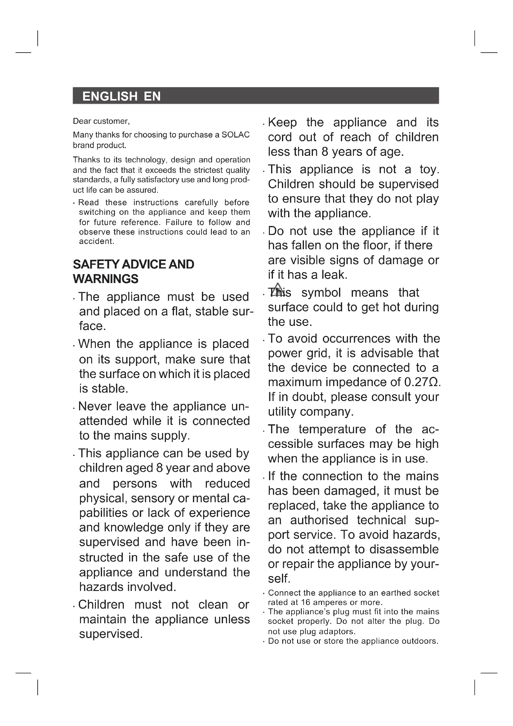 ASSISTANCE This product enjoys the recognition and protec- tion of the legal guarantee in accordance with current legislation. To enforce your rights or inte- rests you must go to any of our ofcial technical assistance services. You can nd the closest one by accessing the following web link: http://solac.com You can also request related information by con- tacting us by phone. You can download this instruction manual and its updates at http://solac.com