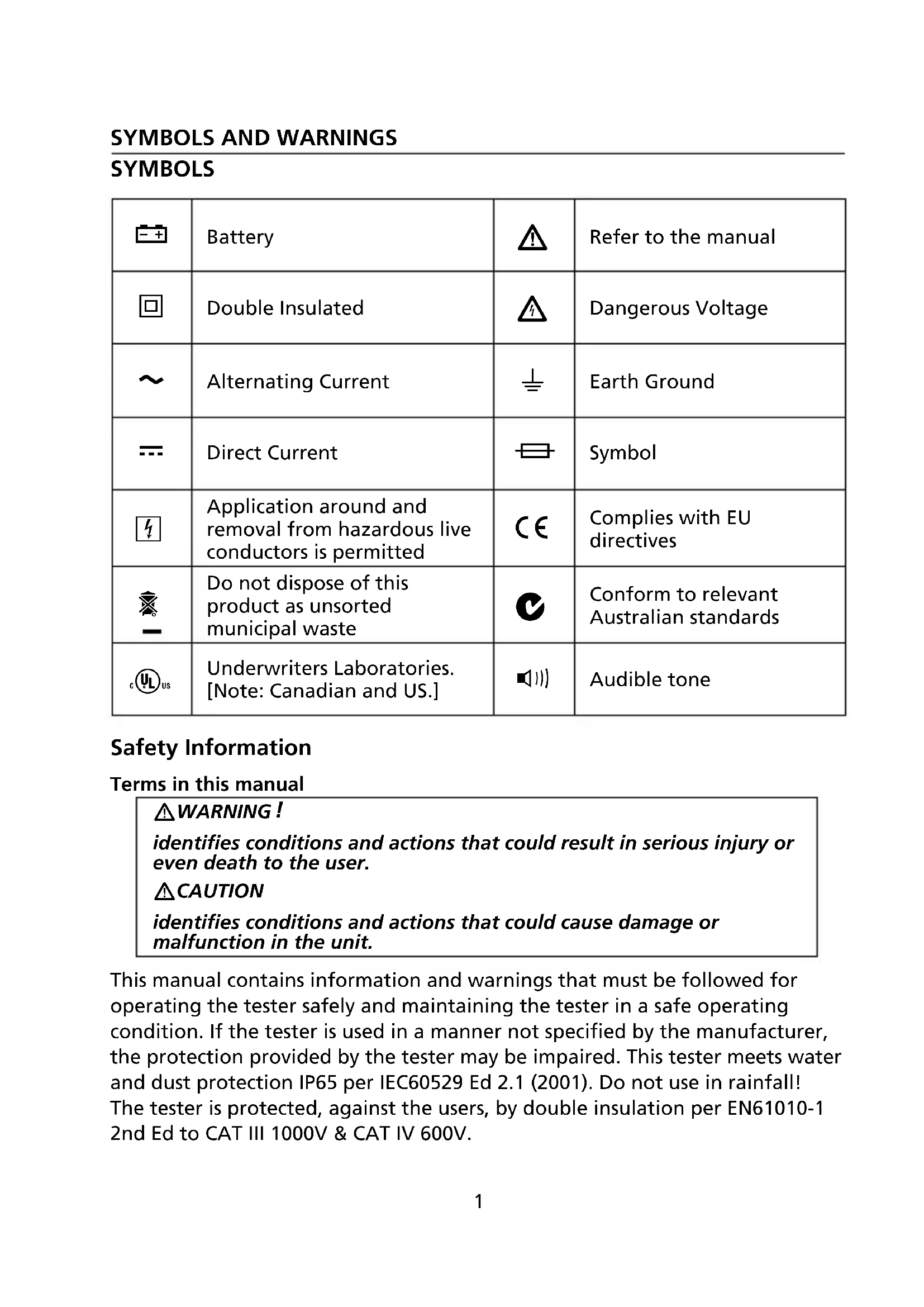 identifies conditions and actions that could result in serious injury or even death to the user. CAUTION identifies conditions and actions that could cause damage or malfunction in the unit. This manual contains information and warnings that must be followed for operating the tester safely and maintaining the tester in a safe operating condition. If the tester is used in a manner not specified by the manufacturer, the protection provided by the tester may be impaired. This tester meets water and dust protection IP65 per IEC60529 Ed 2.1 (2001). Do not use in rainfall! The tester is protected, against the users, by double insulation per EN61010-1 2nd Ed to CAT III 1000V & CAT IV 600V.2 Per IEC61010-1 and IEC60664: Measurement Category IV (CAT IV) is for measurements performed at the source of the low-voltage installation. Examples are electricity meters and measurements on primary overcurrent protection devices and ripple control units. Measurement Category III (CAT III) is for measurements performed in the building installation. Examples are measurements on distribution boards, circuit-breakers, wiring, including cables, bus-bars, junction boxes, switches, socket-outlets in the fixed installation, and equipment for industrial use and some other equipment, for example, stationary motors with permanent connection to the fixed installation. Measurement Category II (CAT II) is for measurements performed on circuits directly connected to the low voltage installation. Examples are measurements on household appliances, portable tools and similar equipment.