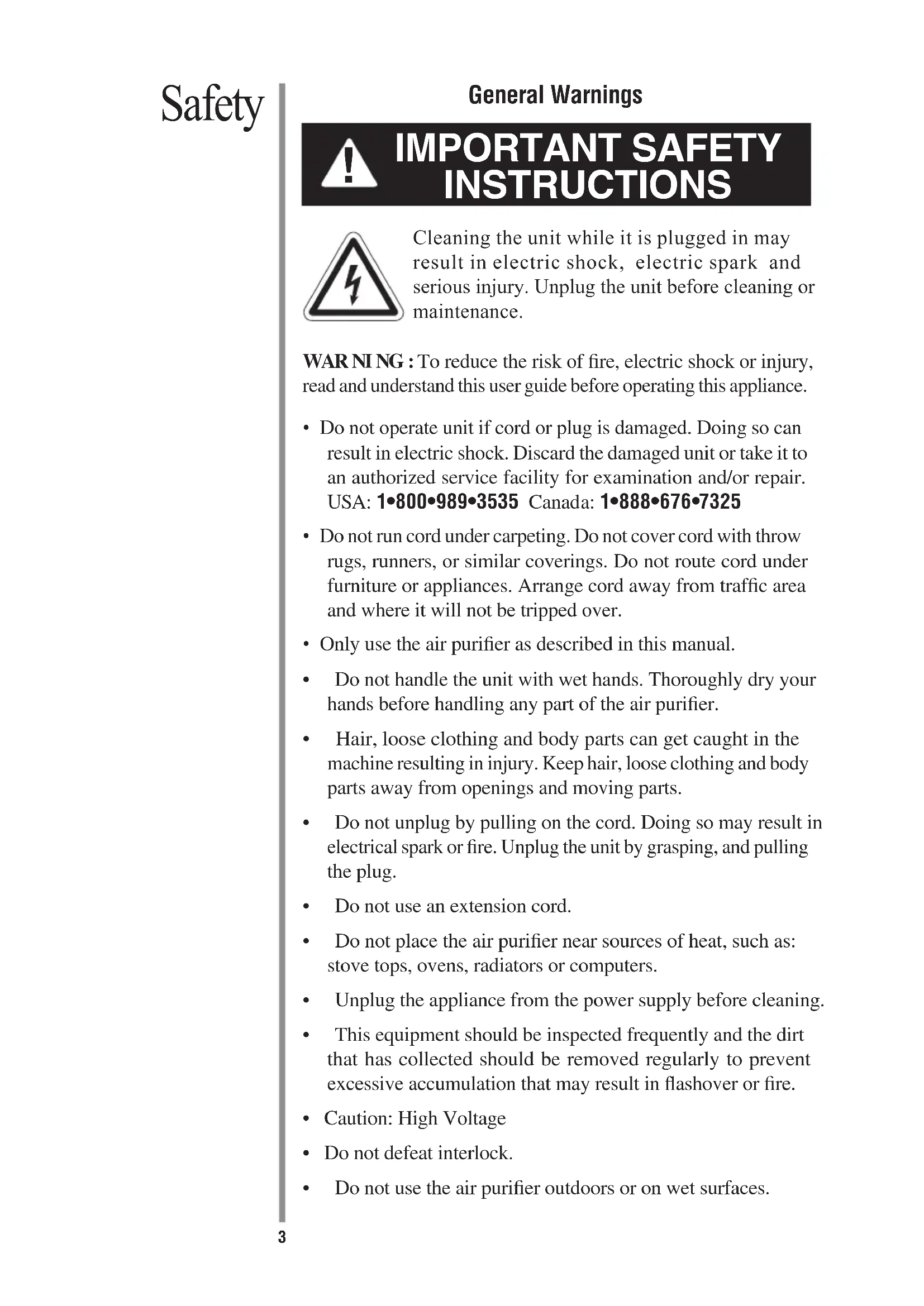 - Do not run cord under carpeting. Do not cover cord with throw rugs, runners, or similar coverings. Do not route cord under furniture or appliances. Arrange cord away from traffic area and where it will not be tripped over.• Only use the air purifier as described in this manual.• Donothandletheunitwithwethands.Thoroughlydryyourhands before handling any part of the air purifier.• Hair,looseclothingandbodypartscangetcaughtinthemachine resulting in injury. Keep hair, loose clothing and body parts away from openings and moving parts.• Donotunplugbypullingonthecord.Doingsomayresultinelectrical spark or fire. Unplug the unit by grasping, and pulling the plug.• Donotuseanextensioncord.• Donotplacetheairpuriernearsourcesofheat,suchas: stove tops, ovens, radiators or computers.• Unplugtheappliancefromthepowersupplybeforecleaning.• Thisequipmentshouldbeinspectedfrequentlyandthedirtthat has collected should be removed regularly to prevent excessive accumulation that may result in flashover or fire.•Caution:HighVoltage•Donotdefeatinterlock.• Donotusetheairpurieroutdoorsoronwetsurfaces.
