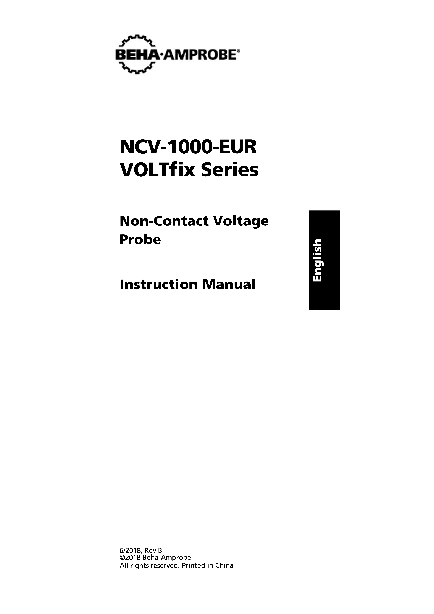 PORNCV-1000-EUR VOLTfix Series Non-Contact Voltage Probe Instruction Manual 6/2018, Rev B ©2018 Beha-Amprobe All rights reserved. Printed in China EnglishLimited Warranty and Limitation of Liability Your Beha-Amprobe product will be free from defects in material and workmanship for one year from the date of purchase unless local laws require otherwise. This warranty does not cover fuses, disposable batteries or damage from accident, neglect, misuse, alteration, contamination, or abnormal conditions of operation or handling. Resellers are not authorized to extend any other warranty on the behalf of Beha-Amprobe. To obtain service during the warranty period, return the product with proof of purchase to an authorized Beha-Amprobe Service Center or to an Beha-Amprobe dealer or distributor. See Repair Section for details. THIS WARRANTY IS YOUR ONLY REMEDY. ALL OTHER WARRANTIES - WHETHER EXPRESS, IMPLIED OR STATUTORY - INCLUDING IMPLIED WARRANTIES OF FITNESS FOR A PARTICULAR PURPOSE OR MERCHANTABILITY, ARE HEREBY DISCLAIMED. MANUFACTURER SHALL NOT BE LIABLE FOR ANY SPECIAL,