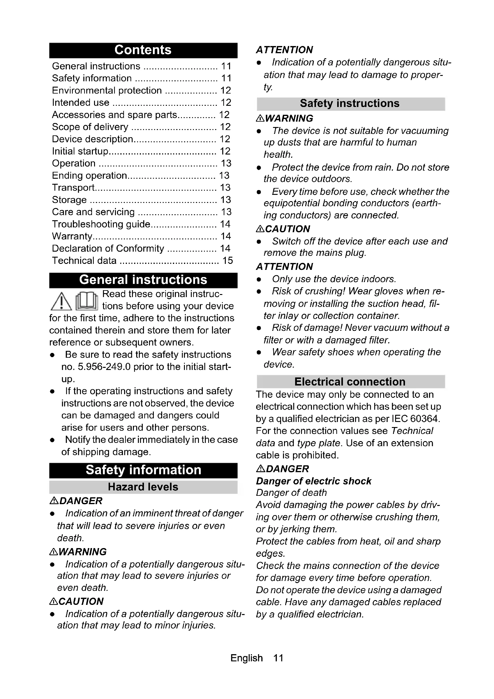 - 3 x 1,5 Teilenummer (EU) 9.979-874.0 Kabellänge m 6,0English 11 Contents General instructions Read these original instruc- tions before using your device for the first time, adhere to the instructions contained therein and store them for later reference or subsequent owners. ● Be sure to read the safety instructions no. 5.956-249.0 prior to the initial start- up. ● If the operating instructions and safety instructions are not observed, the device can be damaged and dangers could arise for users and other persons. ● Notify the dealer immediately in the case of shipping damage. Safety information Hazard levels DANGER ● Indication of an imminent threat of danger that will lead to severe injuries or even death. 몇 WARNING ● Indication of a potentially dangerous situ- ation that may lead to severe injuries or even death. 몇 CAUTION ● Indication of a potentially dangerous situ- ation that may lead to minor injuries. ATTENTION ● Indication of a potentially dangerous situ- ation that may lead to damage to proper- ty. Safety instructions 몇 WARNING ● The device is not suitable for vacuuming up dusts that are harmful to human health. ● Protect the device from rain. Do not store the device outdoors. ● Every time before use, check whether the equipotential bonding conductors (earth- ing conductors) are connected. 몇 CAUTION ● Switch off the device after each use and remove the mains plug. ATTENTION ● Only use the device indoors. ● Risk of crushing! Wear gloves when re- moving or installing the suction head, fil- ter inlay or collection container. ● Risk of damage! Never vacuum without a filter or with a damaged filter. ● Wear safety shoes when operating the device. Electrical connection The device may only be connected to an electrical connection which has been set up by a qualified electrician as per IEC 60364. For the connection values see Technical data and type plate. Use of an extension cable is prohibited. DANGER Danger of electric shock Danger of death Avoid damaging the power cables by driv- ing over them or otherwise crushing them, or by jerking them. Protect the cables from heat, oil and sharp edges. Check the mains connection of the device for damage every time before operation. Do not operate the device using a damaged cable. Have any damaged cables replaced by a qualified electrician. General instructions p. 11