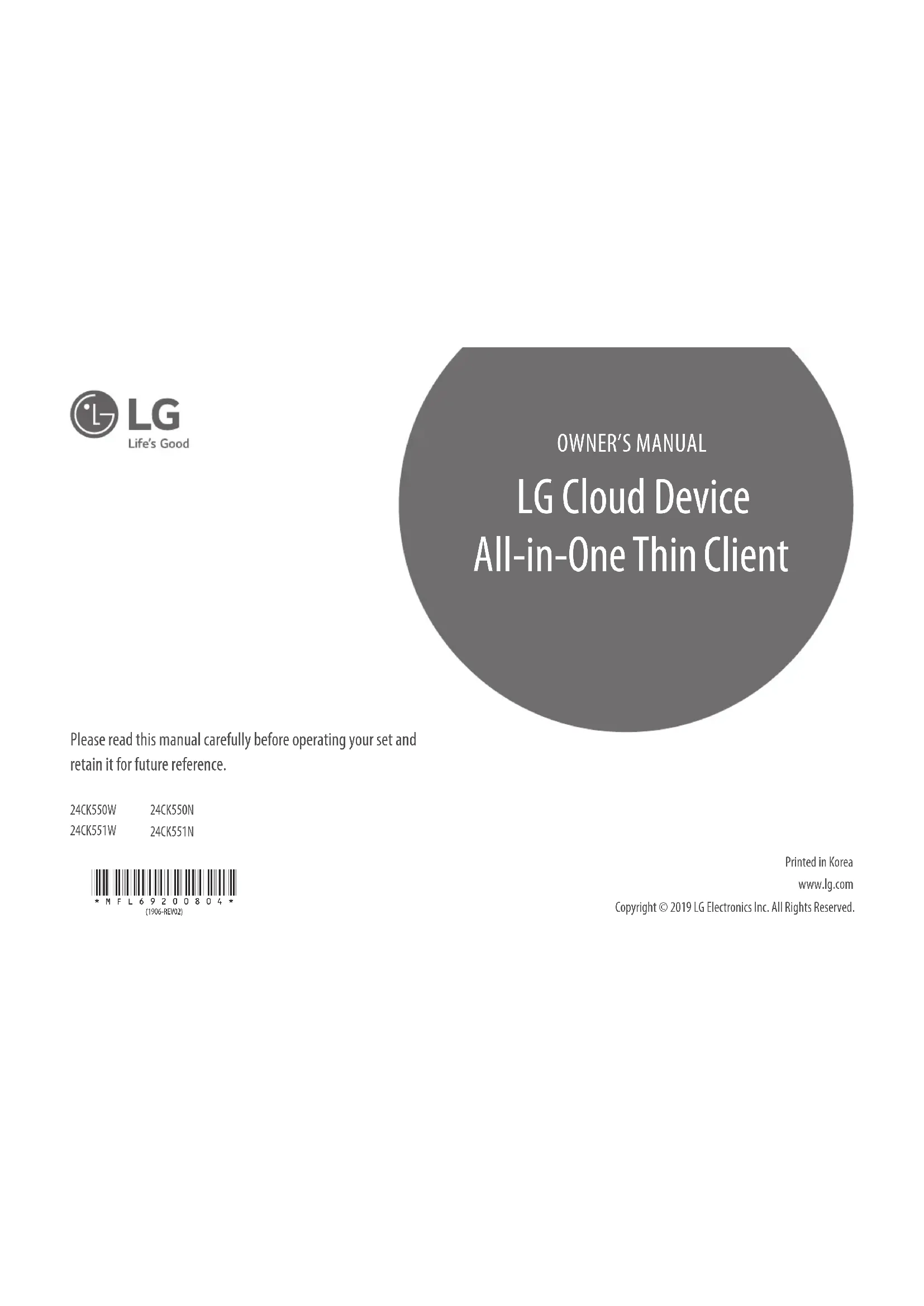 LG Cloud Device All-in-One Thin Client www.lg.com Copyright © 2019 LG Electronics Inc. All Rights Reserved. *MFL69200804* (1906-REV02) Printed in Korea2 ENGLISH LICENSE Each model has different licenses. Visit www.lg.com for more information on the license. The terms HDMI and HDMI High-Definition Multimedia Interface, and the HDMI Logo are trademarks or registered trademarks of HDMI Licensing Administrator, Inc. in the United States and other countries. MaxxAudio and additional MAXX trademarks are trademarks and/ or registered trademarks of Waves Audio Ltd. The SuperSpeed USB Trident logo is a registered trademark of USB Implementers Forum, Inc.