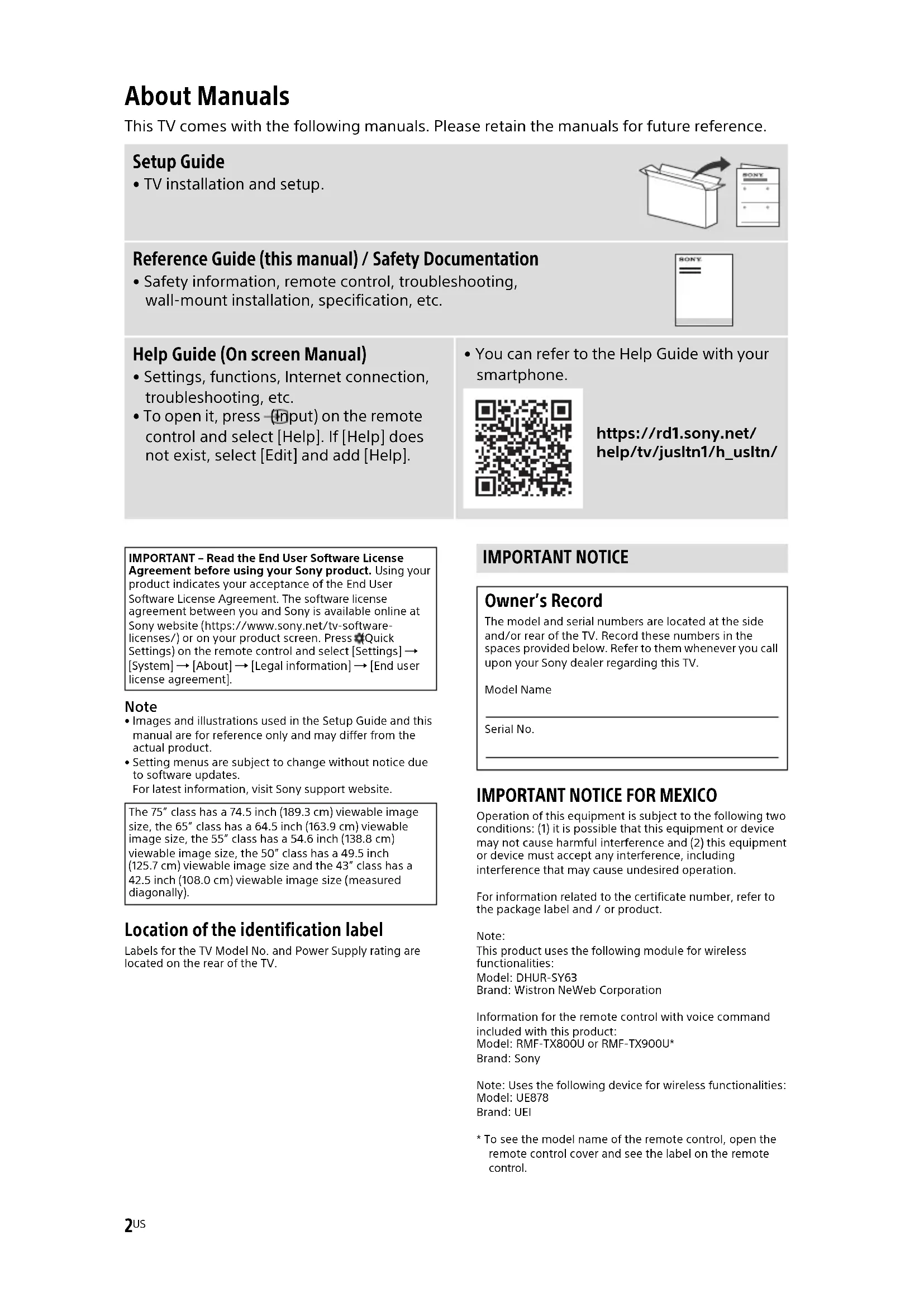 - You can refer to the Help Guide with your smartphone. https://rd1.sony.net/ help/tv/jusltn1/h_usltn/ IMPORTANT – Read the End User Software License Agreement before using your Sony product. Using your product indicates your acceptance of the End User Software License Agreement. The software license agreement between you and Sony is available online at Sony website (https://www.sony.net/tv-software- licenses/) or on your product screen. Press (Quick Settings) on the remote control and select [Settings] [System] [About] [Legal information] [End user license agreement]. The 75” class has a 74.5 inch (189.3 cm) viewable image size, the 65” class has a 64.5 inch (163.9 cm) viewable image size, the 55” class has a 54.6 inch (138.8 cm) viewable image size, the 50” class has a 49.5 inch (125.7 cm) viewable image size and the 43” class has a