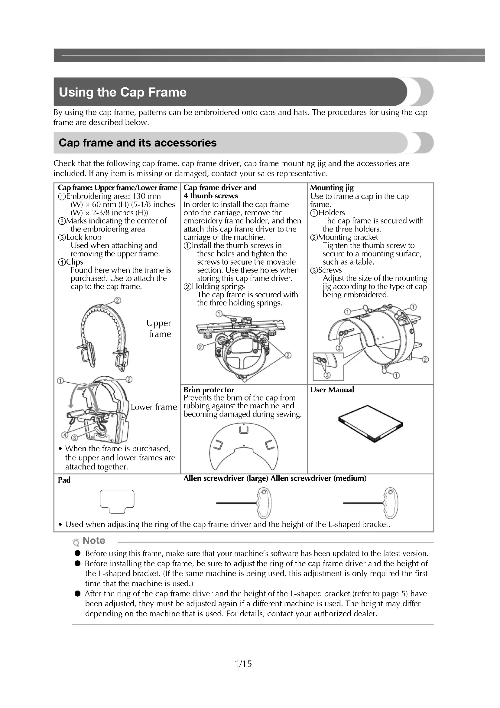 FRANÇAIS ESPAÑOL ENGLISH1/15 Using the Cap Frame By using the cap frame, patterns can be embroidered onto caps and hats. The procedures for using the cap frame are described below. Cap frame and its accessories Check that the following cap frame, cap frame driver, cap frame mounting jig and the accessories are included. If any item is missing or damaged, contact your sales representative. Note