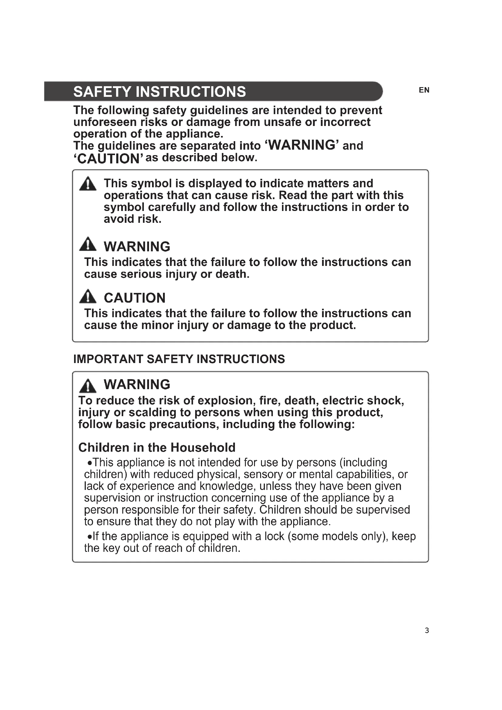 This symbol is displayed to indicate matters and operations that can cause risk. Read the part with this symbol carefully and follow the instructions in order to avoid risk. WARNING This indicates that the failure to follow the instructions can cause serious injury or death. CAUTION This indicates that the failure to follow the instructions can cause the minor injury or damage to the product. WARNING To reduce the risk of explosion, fire, death, electric shock, injury or scalding to persons when using this product, follow basic precautions, including the following: Children in the Household