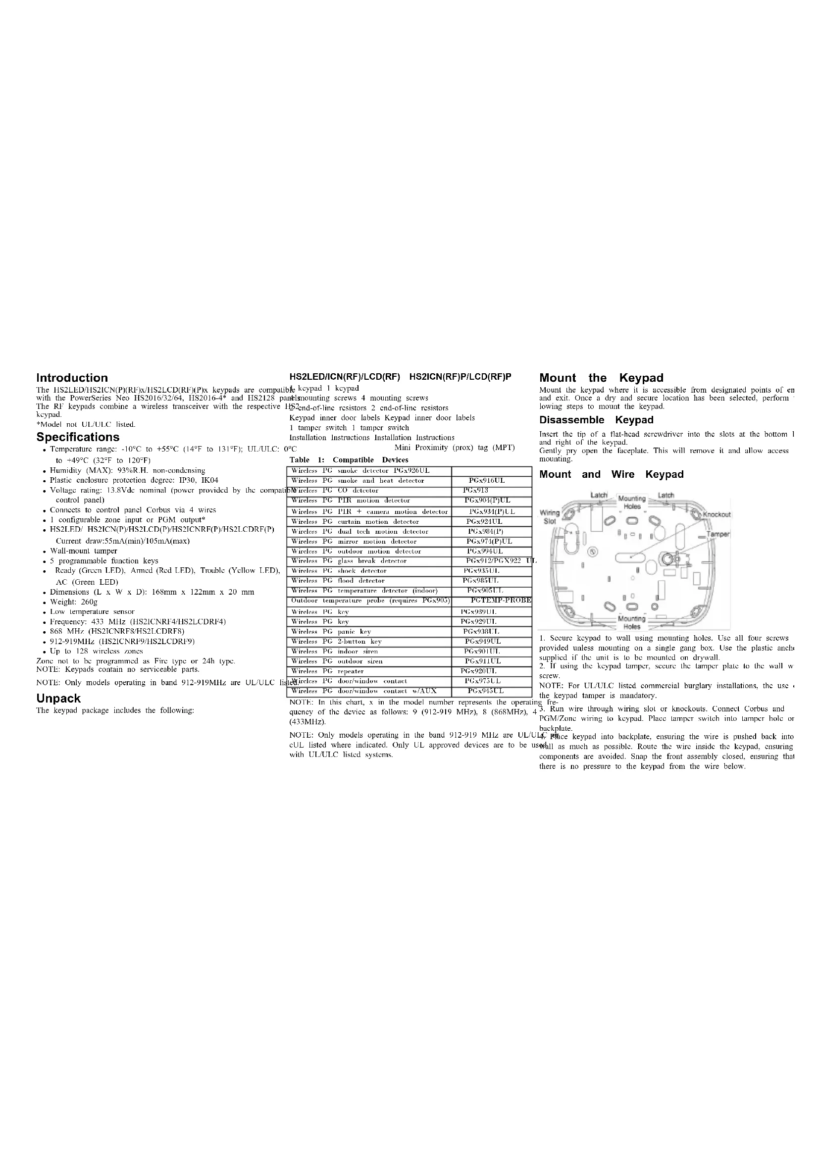 HS2LED/HS2ICON(P)(RF)X/HS2LCD(RF)(P)X V1.3 Installation Instructions/Instructions d’installation/Instrucciones de instalación/Instruções de instalação English, Français, Español, Português 29009811R002 - 1 -Introduction The HS2LED/HS2ICN(P)(RF)x/HS2LCD(RF)(P)x keypads are compatible with the PowerSeries Neo HS2016/32/64, HS2016-4* and HS2128 panels. The RF keypads combine a wireless transceiver with the respective HS2 keypad. *Model not UL/ULC listed. Specifications l Temperature range: -10°C to +55°C (14°F to 131°F); UL/ULC: 0°C to +49°C (32°F to 120°F) l Humidity (MAX): 93%R.H. non-condensingl Plastic enclosure protection degree: IP30, IK04l Voltage rating: 13.8Vdc nominal (power provided by the compatible control panel) l Connects to control panel Corbus via 4 wiresl 1 configurable zone input or PGM output*l HS2LED/ HS2ICN(P)/HS2LCD(P)/HS2ICNRF(P)/HS2LCDRF(P) Current draw:55mA(min)/105mA(max) l Wall-mount tamperl 5 programmable function keys l Ready (Green LED), Armed (Red LED), Trouble (Yellow LED), AC (Green LED) l Dimensions (L x W x D): 168mm x 122mm x 20 mml Weight: 260gl Low temperature sensorl Frequency: 433 MHz (HS2ICNRF4/HS2LCDRF4)l 868 MHz (HS2ICNRF8/HS2LCDRF8)l 912-919MHz (HS2ICNRF9/HS2LCDRF9)l Up to 128 wireless zones Zone not to be programmed as Fire type or 24h type. NOTE: Keypads contain no serviceable parts. NOTE: Only models operating in band 912-919MHz are UL/ULC listed. Unpack The keypad package includes the following: HS2LED/ICN(RF)/LCD(RF) HS2ICN(RF)P/LCD(RF)P 1 keypad 1 keypad 4 mounting screws 4 mounting screws 2 end-of-line resistors 2 end-of-line resistors Keypad inner door labels Keypad inner door labels 1 tamper switch 1 tamper switch Installation Instructions Installation Instructions Mini Proximity (prox) tag (MPT) Table 1: Compatible Devices Wireless PG smoke detector PGx926UL Wireless PG smoke and heat detector PGx916UL Wireless PG CO detector PGx913 Wireless PG PIR motion detector PGx904(P)UL Wireless PG PIR + camera motion detector PGx934(P)UL Wireless PG curtain motion detector PGx924UL Wireless PG dual tech motion detector PGx984(P) Wireless PG mirror motion detector PGx974(P)UL Wireless PG outdoor motion detector PGx994UL Wireless PG glass break detector PGx912/PGX922 UL Wireless PG shock detector PGx935UL Wireless PG flood detector PGx985UL Wireless PG temperature detector (indoor) PGx905UL Outdoor temperature probe (requires PGx905) PGTEMP-PROBE Wireless PG key PGx939UL Wireless PG key PGx929UL Wireless PG panic key PGx938UL Wireless PG 2-button key PGx949UL Wireless PG indoor siren PGx901UL Wireless PG outdoor siren PGx911UL Wireless PG repeater PGx920UL Wireless PG door/window contact PGx975UL Wireless PG door/window contact w/AUX PGx945UL NOTE: In this chart, x in the model number represents the operating fre- quency of the device as follows: 9 (912-919 MHz), 8 (868MHz), 4 (433MHz). NOTE: Only models operating in the band 912-919 MHz are UL/ULC or cUL listed where indicated. Only UL approved devices are to be used with UL/ULC listed systems. Mount the Keypad Mount the keypad where it is accessible from designated points of entry and exit. Once a dry and secure location has been selected, perform the fol- lowing steps to mount the keypad. Disassemble Keypad Insert the tip of a flat-head screwdriver into the slots at the bottom left and right of the keypad. Gently pry open the faceplate. This will remove it and allow access for mounting. Mount and Wire Keypad