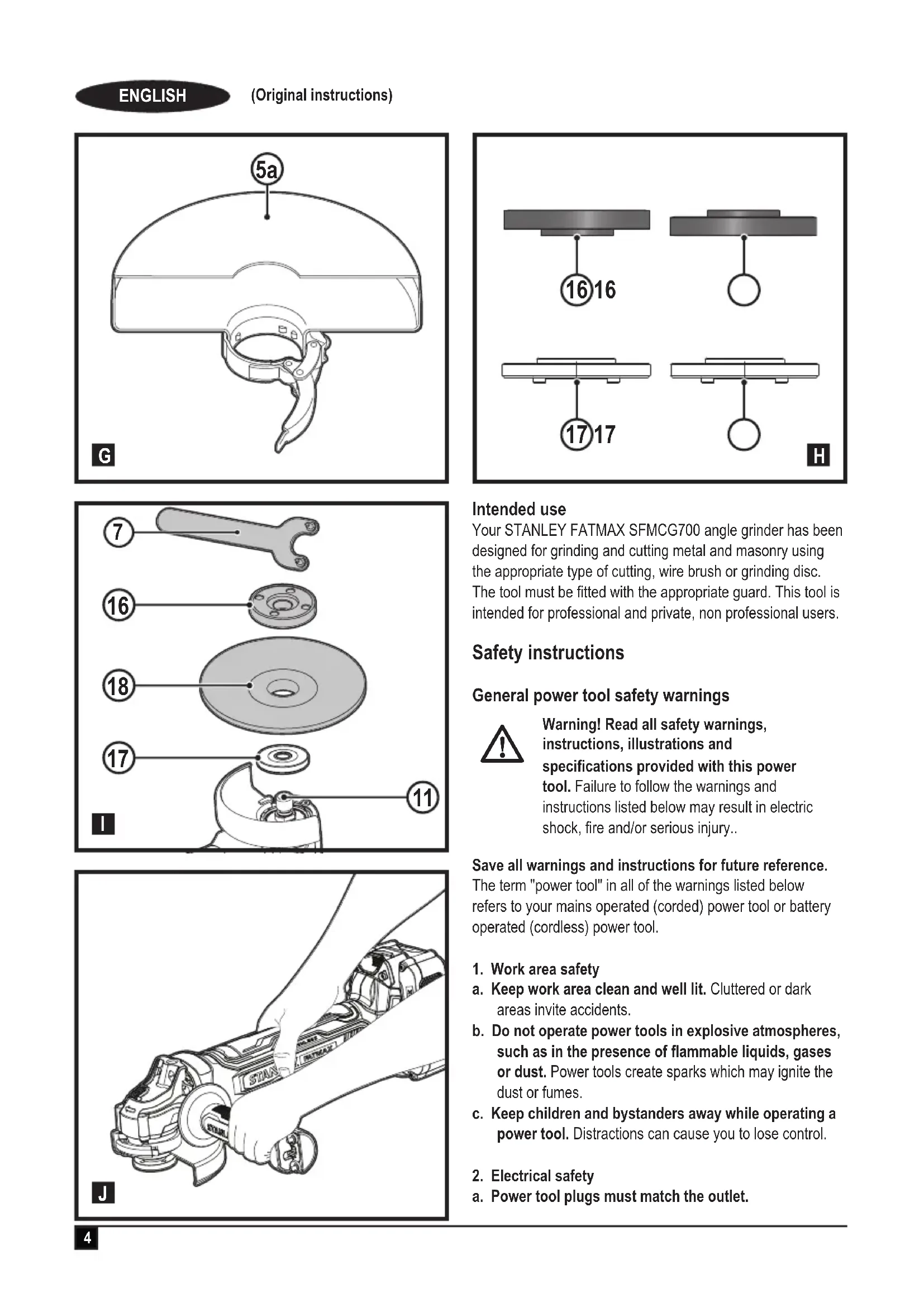 Intended use Your STANLEY FATMAX SFMCG700 angle grinder has been designed for grinding and cutting metal and masonry using the appropriate type of cutting, wire brush or grinding disc. The tool must be tted with the appropriate guard. This tool is intended for professional and private, non professional users. Safety instructions General power tool safety warnings