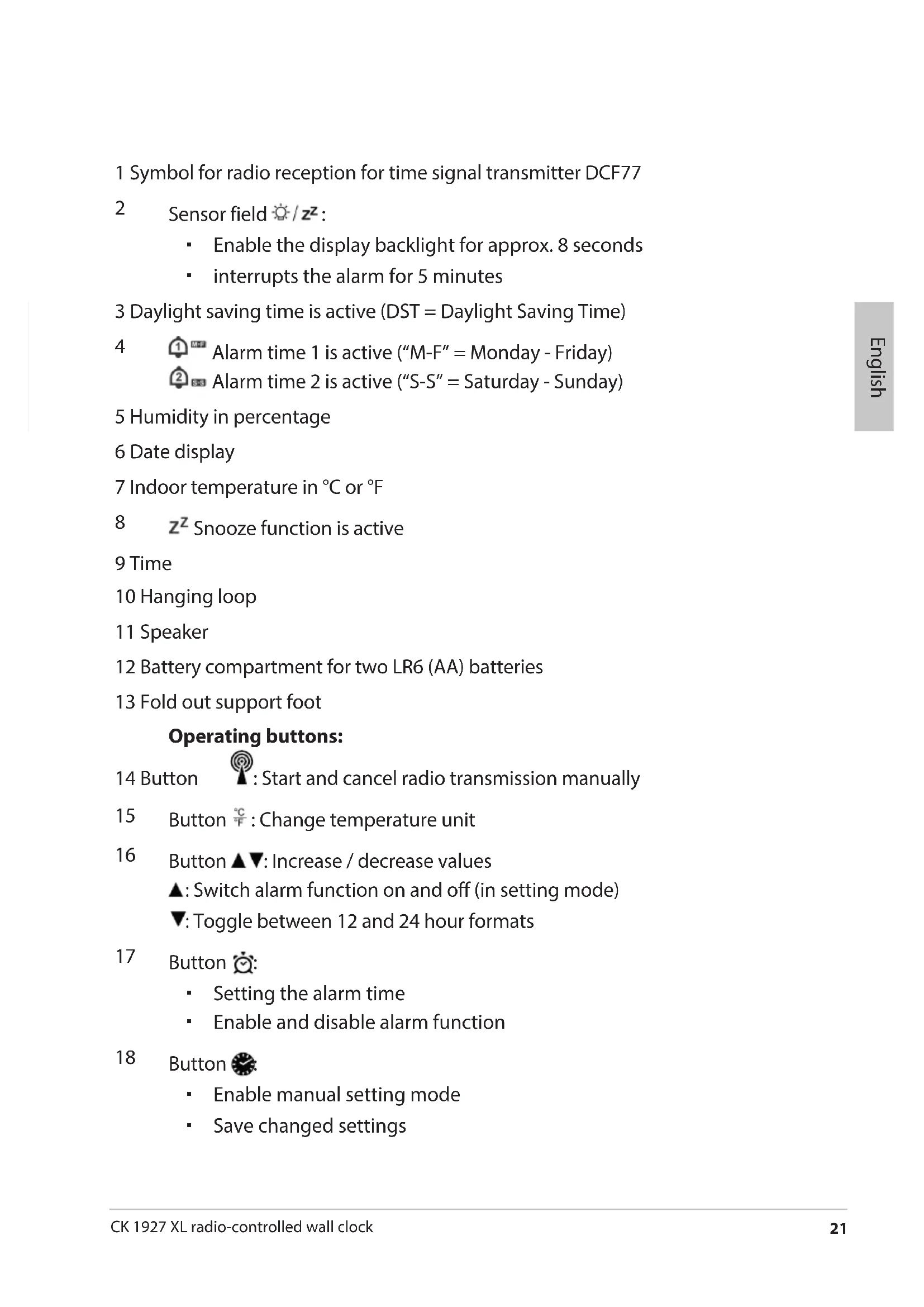 CK 1927 XL radio-controlled wall clock English 1 Symbol for radio reception for time signal transmitter DCF77