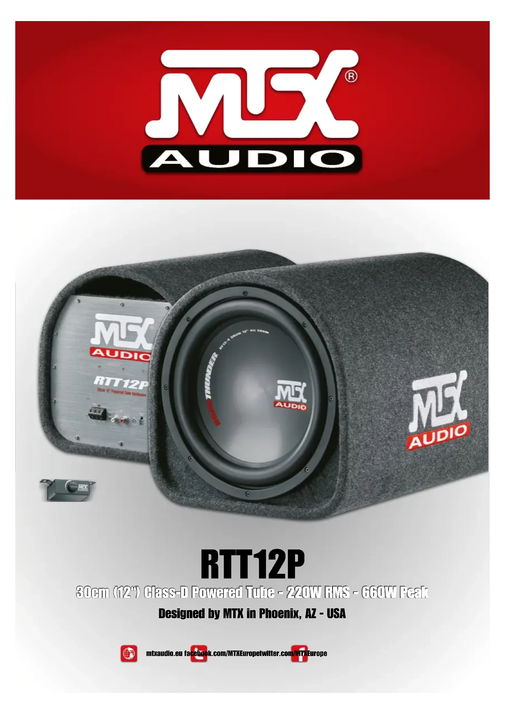 mtxaudio.eu facebook.com/MTXEuropetwitter.com/MTXEurope RTT12P 30cm (12“) Class-D Powered Tube - 220W RMS - 660W Peak Designed by MTX in Phoenix, AZ - USALeft Right Power