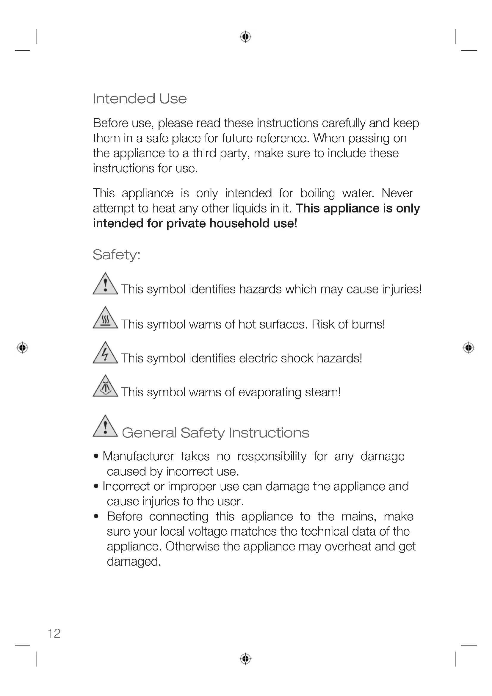 - Your kettle is only intended for boiling water. Never attempt to heat any other liquids in it.