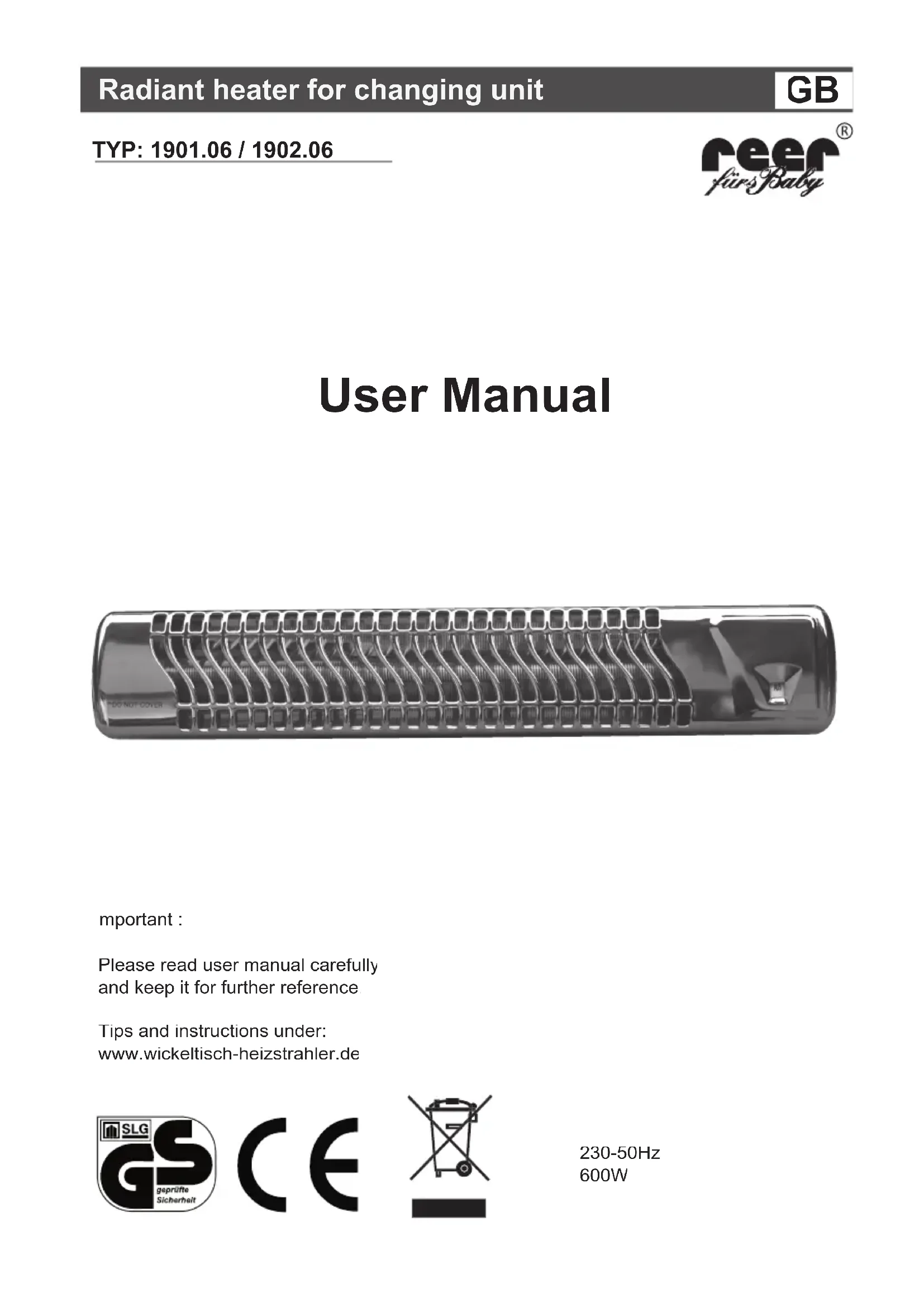 250mmCleaning: Cleaning: Before cleaning is begun, please ensure that the device is switched off and cooled down (draw the plug). Clean the surface with a dry or damp cloth. The refl ector and heating bar can only be cleaned by an expert. Repair: Repair: The device may only be repaired by an expert. Technical details: Mains voltage : 230 V Power : 600 W Type of assembly: power plug in socket or fi xed connection Protection class: 1 Irradiating angle : 90° 9Guarantee This device has been produced with intact material and the utmost care. Therefore Reer grants a guarantee period of 2 years after date of purchase against defective materials and workmanship. In the unlikely event that you are confronted with such a defect, you should complete the yellow warranty card and contact your dealer. Warranty cannot be granted if: - the device is used improperly and not for its intended purpose - the device is connected to wrong mains voltage - unauthorised repairs are made - the warranty card is improperly completed. (Do not forget to attach your sales slip.) REER GmbH, Riedwiesenstrasse 7, 71229 Leonberg, Germany - - - - - - - - - - - - - - - - - - - - - - - - - - - - - - - - - - - - - - - - - - - - - - Type: 1901.06