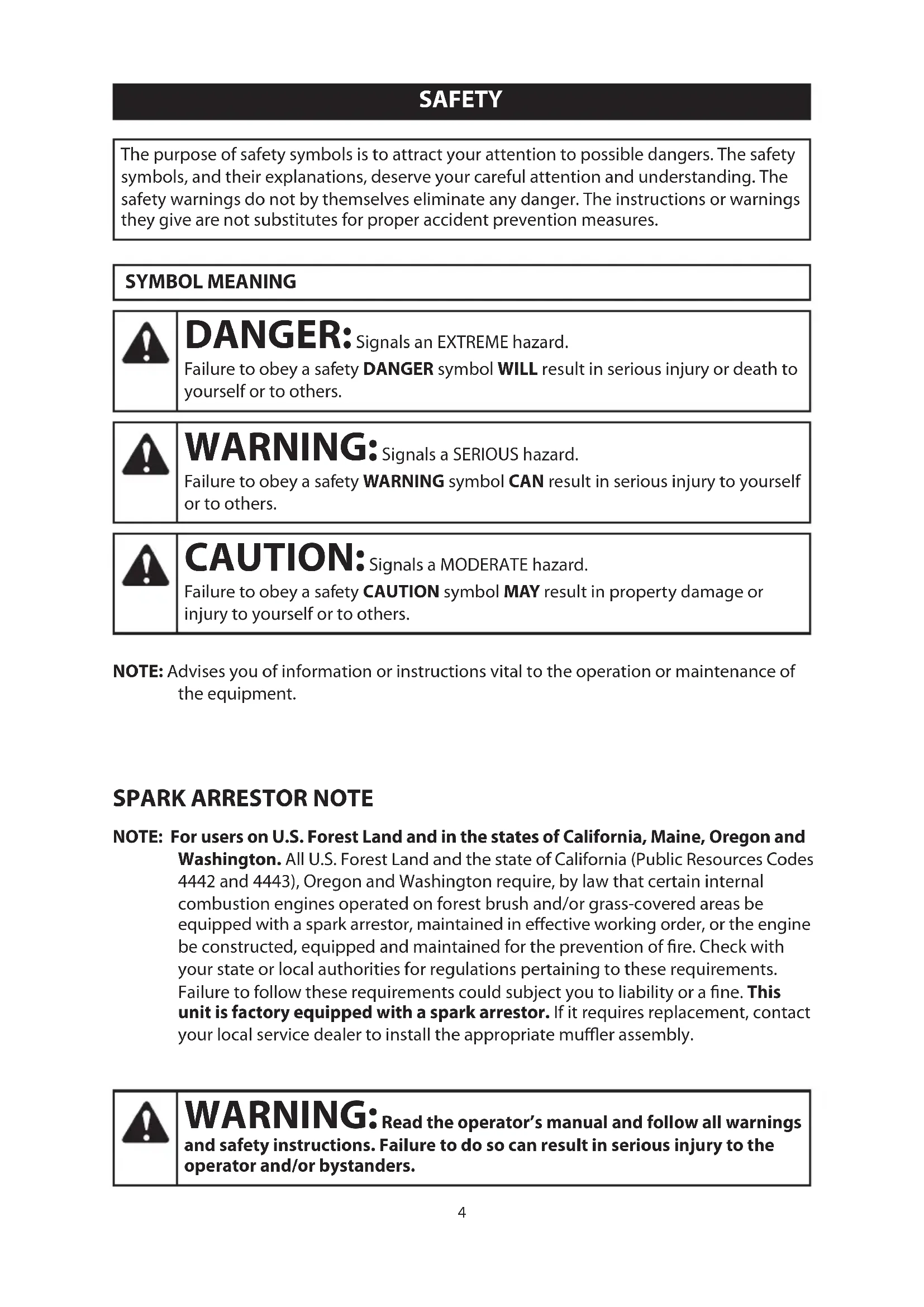 NOTE: For users on U.S. Forest Land and in the states of California, Maine, Oregon and Washington. All U.S. Forest Land and the state of California (Public Resources Codes 4442 and 4443), Oregon and Washington require, by law that certain internal combustion engines operated on forest brush and/or grass-covered areas be equipped with a spark arrestor, maintained in eective working order, or the engine be constructed, equipped and maintained for the prevention of re. Check with your state or local authorities for regulations pertaining to these requirements. Failure to follow these requirements could subject you to liability or a ne. This unit is factory equipped with a spark arrestor. If it requires replacement, contact your local service dealer to install the appropriate muer assembly. SYMBOL MEANING