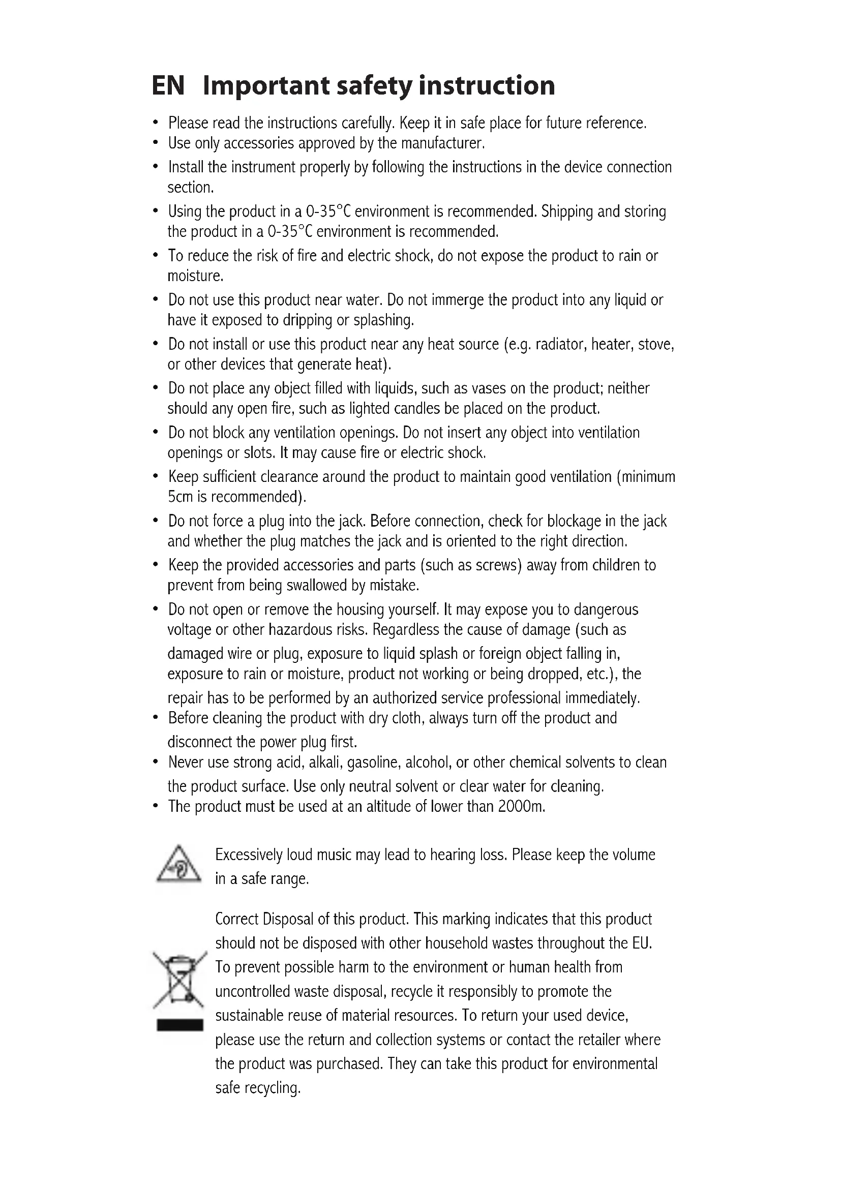 - The product must be used at an altitude of lower than 2000m. Excessively loud music may lead to hearing loss. Please keep the volume in a safe range. Correct Disposal of this product. This marking indicates that this product should not be disposed with other household wastes throughout the EU. To prevent possible harm to the environment or human health from uncontrolled waste disposal, recycle it responsibly to promote the sustainable reuse of material resources. To return your used device, please use the return and collection systems or contact the retailer where the product was purchased. They can take this product for environmental safe recycling.For wireless product: