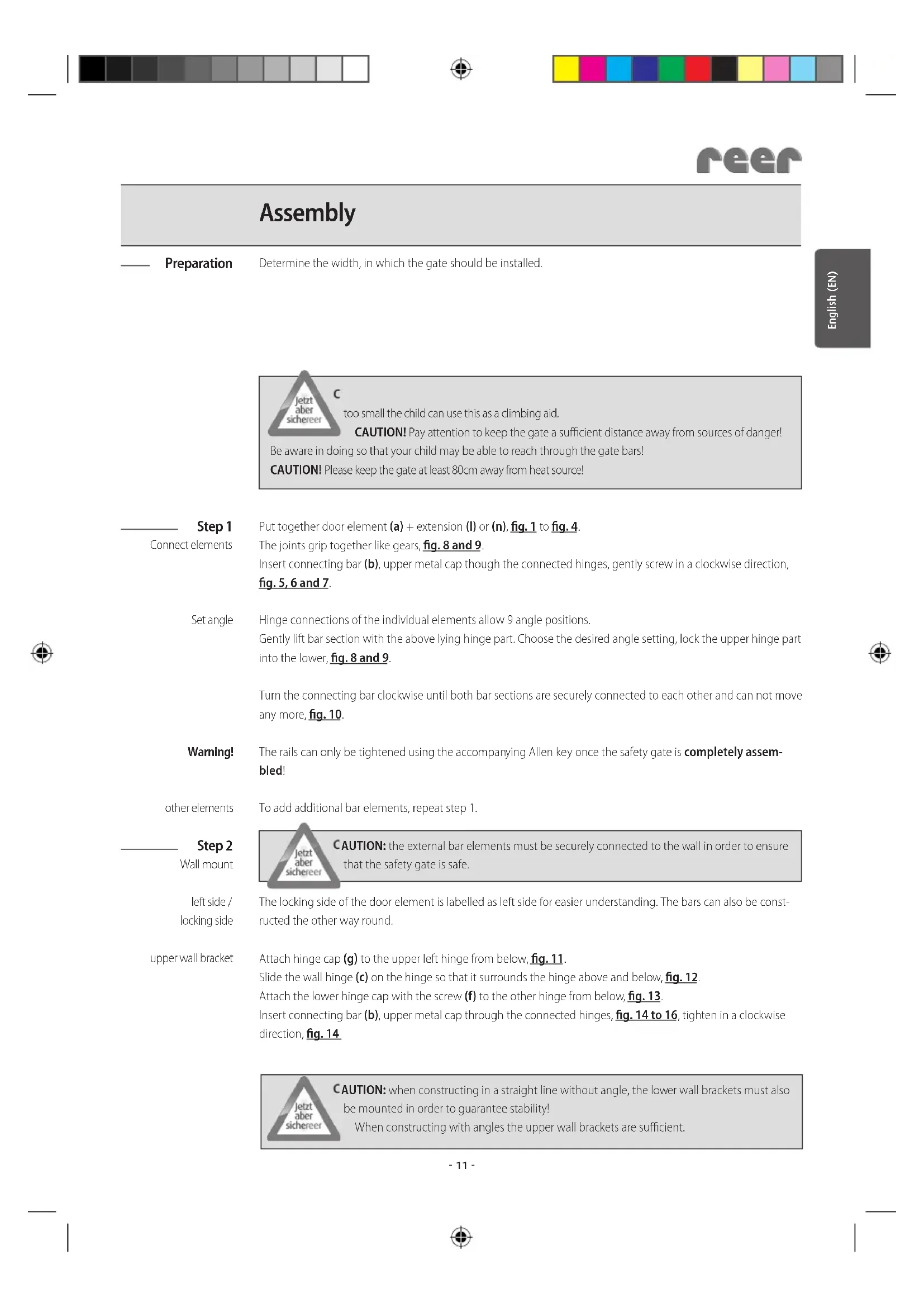 V2V1T Assembly options personalise your individual safety gate English (EN)- 11 - English (EN) Preparation Step 1 Connect elements Set angle Warning! other elements Step 2 Wall mount left side / locking side upper wall bracket Determine the width, in which the gate should be installed.