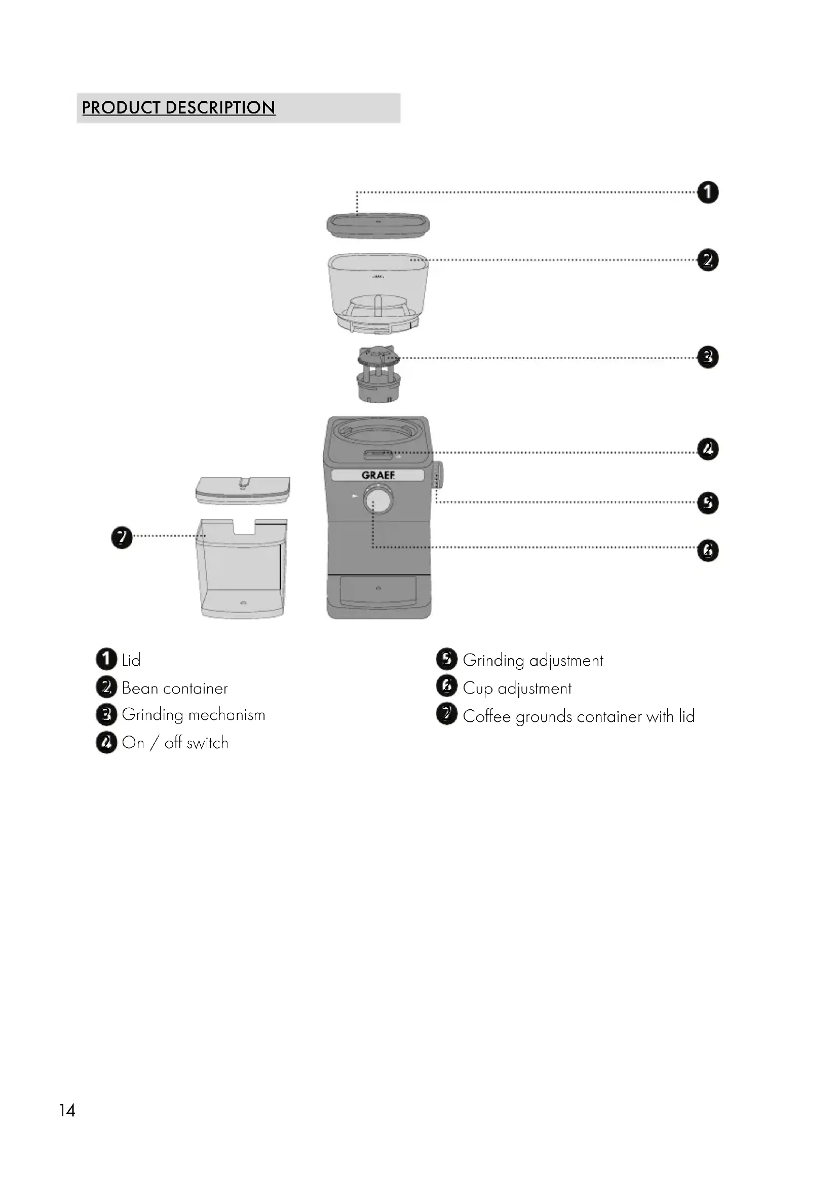UKR PREFACE Dear Customer, You have made a good choice by buying this coffee grinder. You have purchased a rec- ognised quality product. Thank you very much for buying our product. We wish you a lot pleasure with your new Graef coffee grinder.