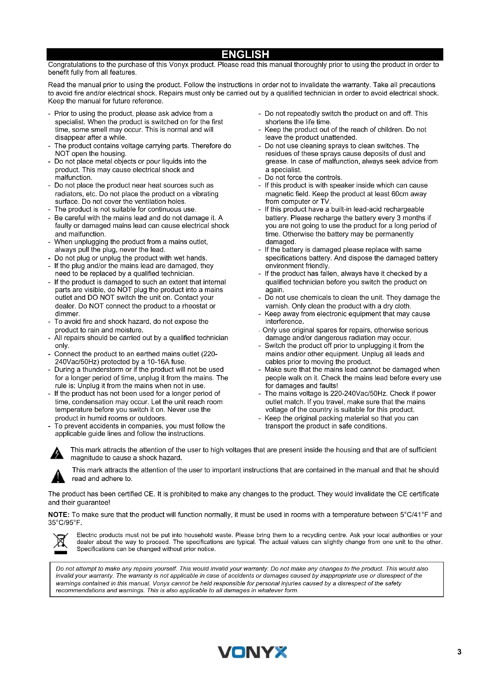 V1.123 ENGLISH Congratulations to the purchase of this Vonyx product. Please read this manual thoroughly prior to using the product in order to benefit fully from all features. Read the manual prior to using the product. Follow the instructions in order not to invalidate the warranty. Take all precautions to avoid fire and/or electrical shock. Repairs must only be carried out by a qualified technician in order to avoid electrical shock. Keep the manual for future reference. - Prior to using the product, please ask advice from a specialist. When the product is switched on for the first time, some smell may occur. This is normal and will disappear after a while. - The product contains voltage carrying parts. Therefore do NOT open the housing. - Do not place metal objects or pour liquids into the product. This may cause electrical shock and malfunction. - Do not place the product near heat sources such as radiators, etc. Do not place the product on a vibrating surface. Do not cover the ventilation holes. - The product is not suitable for continuous use. - Be careful with the mains lead and do not damage it. A faulty or damaged mains lead can cause electrical shock and malfunction. - When unplugging the product from a mains outlet, always pull the plug, never the lead. - Do not plug or unplug the product with wet hands. - If the plug and/or the mains lead are damaged, they need to be replaced by a qualified technician. - If the product is damaged to such an extent that internal parts are visible, do NOT plug the product into a mains outlet and DO NOT switch the unit on. Contact your dealer. Do NOT connect the product to a rheostat or dimmer. - To avoid fire and shock hazard, do not expose the product to rain and moisture. - All repairs should be carried out by a qualified technician only. - Connect the product to an earthed mains outlet (220- 240Vac/50Hz) protected by a 10-16A fuse. - During a thunderstorm or if the product will not be used for a longer period of time, unplug it from the mains. The rule is: Unplug it from the mains when not in use. - If the product has not been used for a longer period of time, condensation may occur. Let the unit reach room temperature before you switch it on. Never use the product in humid rooms or outdoors. - To prevent accidents in companies, you must follow the applicable guide lines and follow the instructions. - Do not repeatedly switch the product on and off. This shortens the life time. - Keep the product out of the reach of children. Do not leave the product unattended. - Do not use cleaning sprays to clean switches. The residues of these sprays cause deposits of dust and grease. In case of malfunction, always seek advice from a specialist. - Do not force the controls. - If this product is with speaker inside which can cause magnetic field. Keep the product at least 60cm away from computer or TV. - If this product have a built-in lead-acid rechargeable battery. Please recharge the battery every 3 months if you are not going to use the product for a long period of time. Otherwise the battery may be permanently damaged. - If the battery is damaged please replace with same specifications battery. And dispose the damaged battery environment friendly. - If the product has fallen, always have it checked by a qualified technician before you switch the product on again. - Do not use chemicals to clean the unit. They damage the varnish. Only clean the product with a dry cloth. - Keep away from electronic equipment that may cause interference. - Only use original spares for repairs, otherwise serious damage and/or dangerous radiation may occur. - Switch the product off prior to unplugging it from the mains and/or other equipment. Unplug all leads and cables prior to moving the product. - Make sure that the mains lead cannot be damaged when people walk on it. Check the mains lead before every use for damages and faults! - The mains voltage is 220-240Vac/50Hz. Check if power outlet match. If you travel, make sure that the mains voltage of the country is suitable for this product. - Keep the original packing material so that you can transport the product in safe conditions. This mark attracts the attention of the user to high voltages that are present inside the housing and that are of sufficient magnitude to cause a shock hazard. This mark attracts the attention of the user to important instructions that are contained in the manual and that he should read and adhere to. The product has been certified CE. It is prohibited to make any changes to the product. They would invalidate the CE certificate and their guarantee! NOTE: To make sure that the product will function normally, it must be used in rooms with a temperature between 5°C/41°F and 35°C/95°F. Electric products must not be put into household waste. Please bring them to a recycling centre. Ask your local authorities or your dealer about the way to proceed. The specifications are typical. The actual values can slightly change from one unit to the other. Specifications can be changed without prior notice.