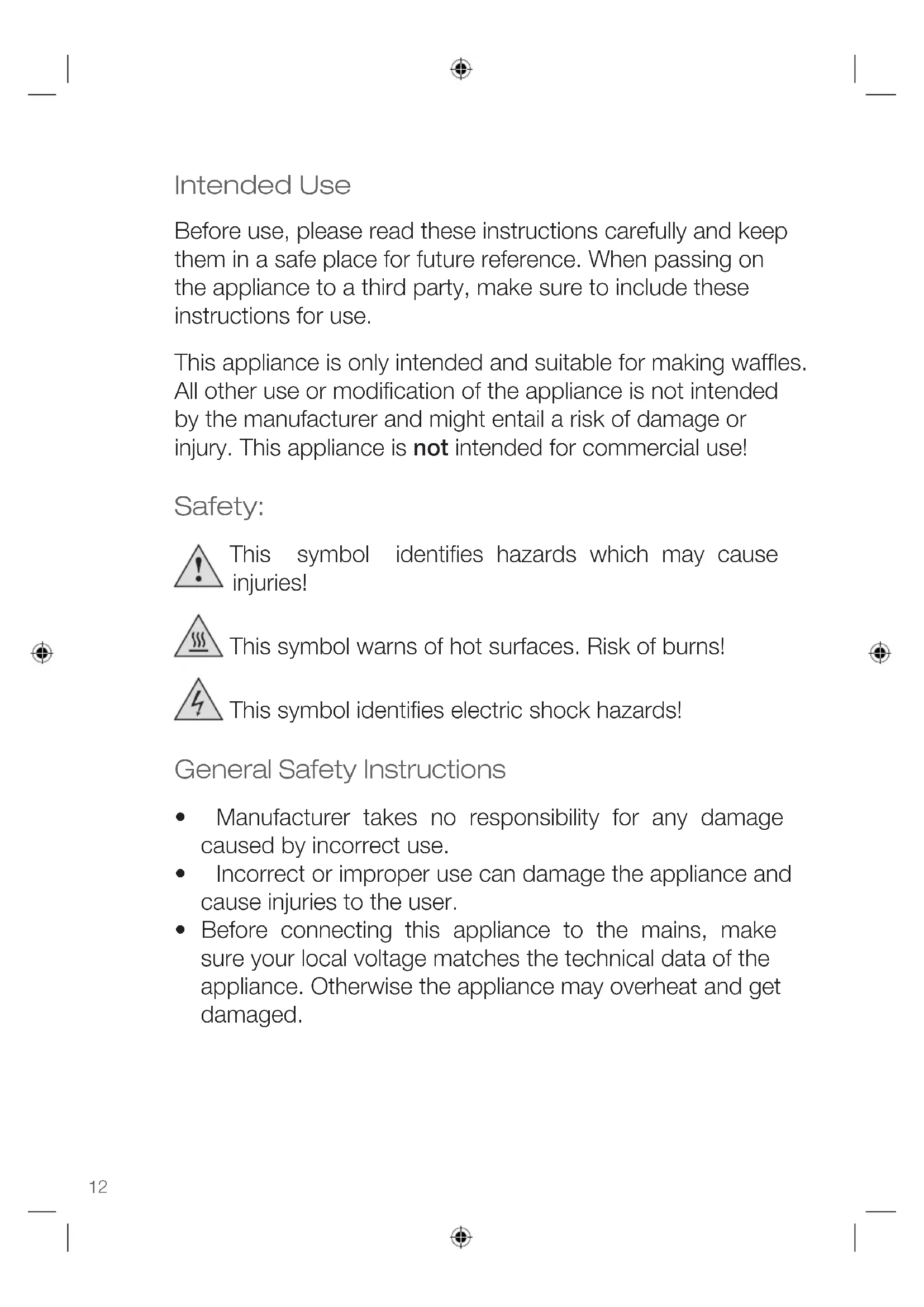 - Place waffles on a cake rack to keep them crispy. Stacked waffles get soggy easily. Belgian Waffles (Gaufres de Liège) Ingredients: - 400g wheat flour - 160ml lukewarm milk - 2 eggs - 150g coarse sugar - 50g sugar - 1 pinch of salt - ½ packet dry yeast - 100g butter, room temperature - 1 vanilla bean, core Preparation: Combine the wheat flour, dry yeast, salt and sugar, properly. Add the eggs, butter and core of the vanilla bean. Stir in the lukewarm milk until the batter is smooth. In order for the dough to rise, leave it to rest for approx. 45 minutes. Before starting the baking process knead in the coarse sugar. Preheat the appliance and bake small amounts of the batter for approx. 5 – 10 minutes. Delicious! If you prefer them with a chocolate icing, just dip half of the waffle into melted chocolate. Yum! Basic recipe Ingredients: 80 g butter 60 g sugar 3 eggs 3/8 l milk 300 g flour 2 teaspoons of baking powder Rum to your taste Icing sugar Preparation: Mix butter with sugar, vanilla sugar and eggs until smooth. Alternatively, add flour/baking powder mix and milk. Add less milk and some rum instead, according to taste. However, be careful when adding liquid, as batter should not be too thin. Bake waffles following the above instructions. Dust with icing sugar before serving.Instruction Manual ENGLISH