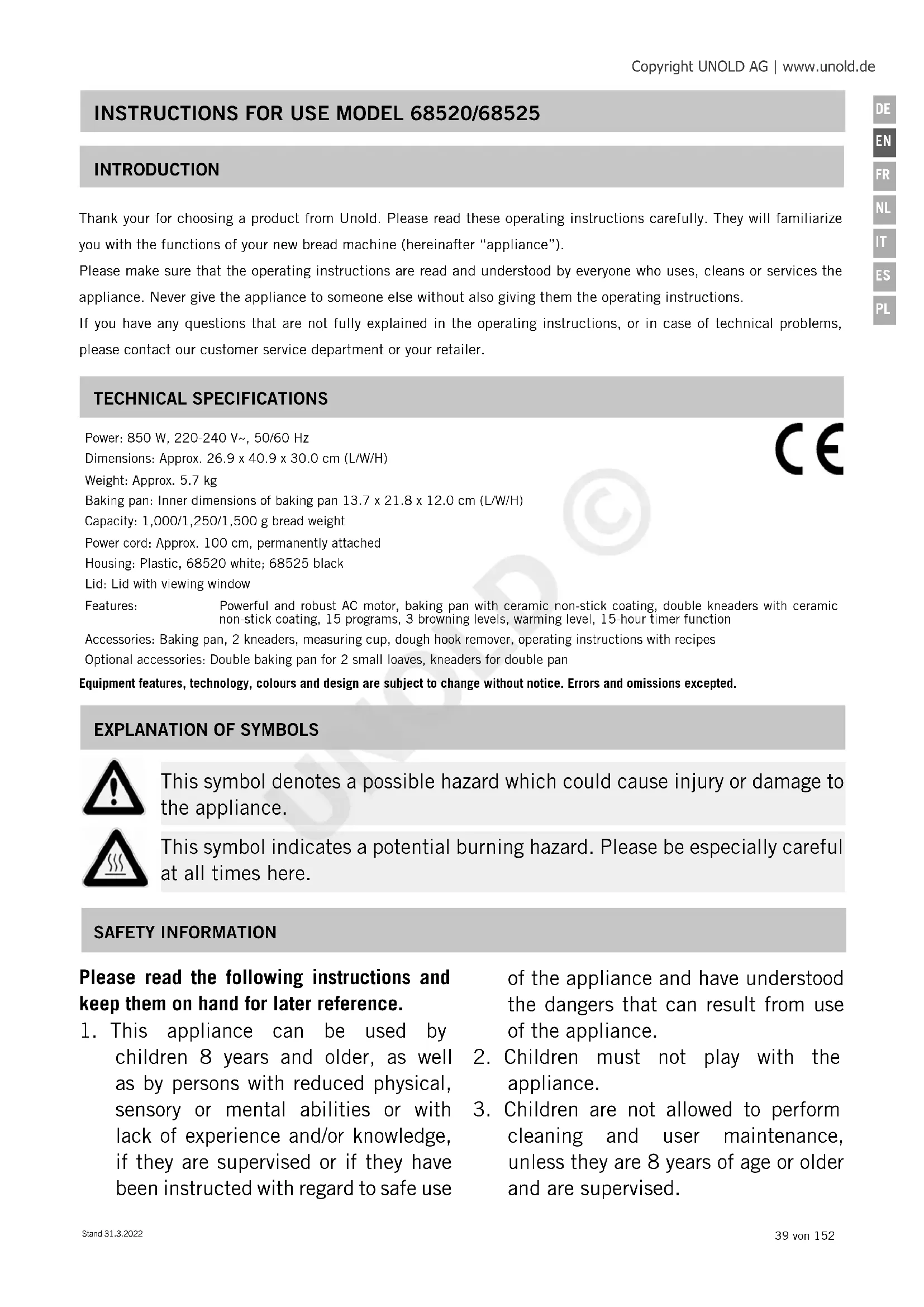This symbol denotes a possible hazard which could cause injury or damage to the appliance. This symbol indicates a potential burning hazard. Please be especially careful at all times here. INTRODUCTION Thank your for choosing a product from Unold. Please read these operating instructions carefully. They will familiarize you with the functions of your new bread machine (hereinafter “appliance”). Please make sure that the operating instructions are read and understood by everyone who uses, cleans or services the appliance. Never give the appliance to someone else without also giving them the operating instructions. If you have any questions that are not fully explained in the operating instructions, or in case of technical problems, please contact our customer service department or your retailer. Copyright UNOLD AG | www.unold.de UNOLD ©40 von 152 Stand 31.3.2022