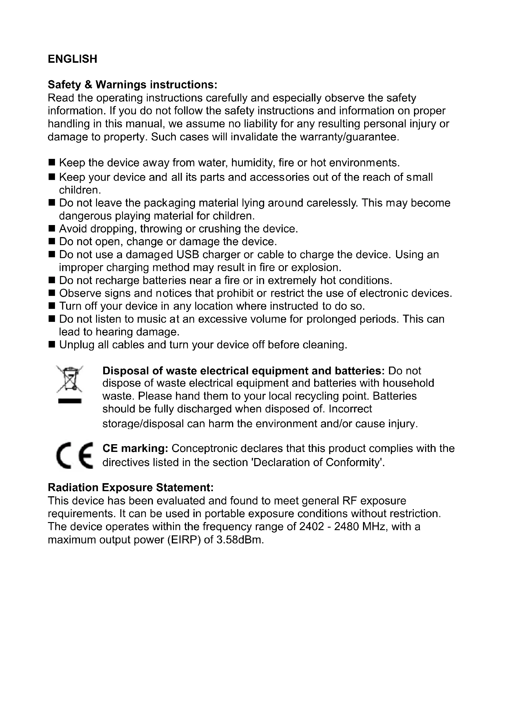 CE marking: Conceptronic declares that this product complies with the directives listed in the section 'Declaration of Conformity'.